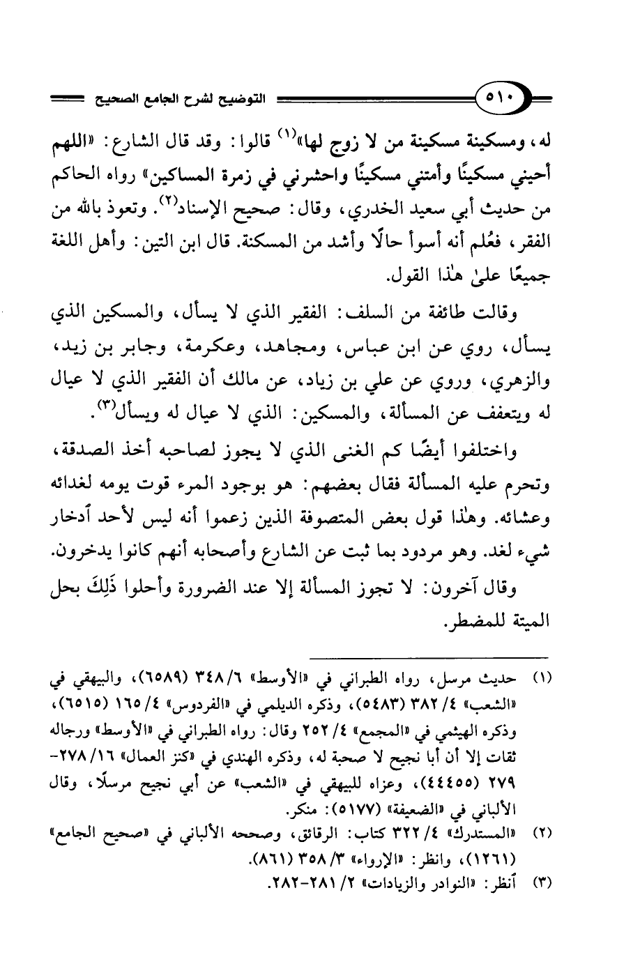 وقالت طائفة من السلف: الفقير الذي لا يسأل، والمسكين الذي يسأل، روي عن ابن عباس، ومجاهد، وعكرمة، وجابر بن زيد، والزهري، وروي عن علي بن زياد، عن مالك أن الفقير الذي لا عيال له ويتعفف عن المسألة، والمسكين: الذي لا عيال له ويسأل (¬3).