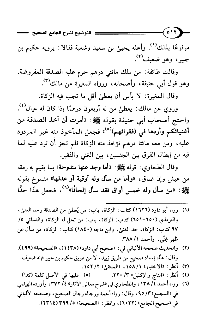 (¬2) والحديث صححه الألباني في: "صحيح أبي داود" (1438)، "الصحيحة" (499). وقال: هذا إسناد صحيح من طريق زبيد، لا من طريق حكيم بن جبير فإنه ضعيف.