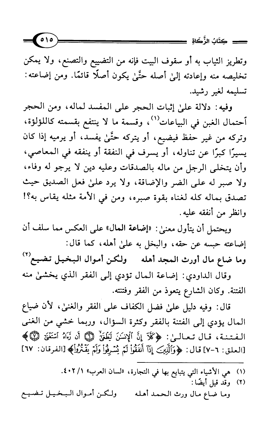 وتطريز الثياب به أو سقوف البيت فإنه من التضييع والتصنع، ولا يمكن تخليصه منه وإعادته إلى أصله حتَّى يكون أصلًا قائمًا. ومن إضاعته: تسليمه لغير رشيد.