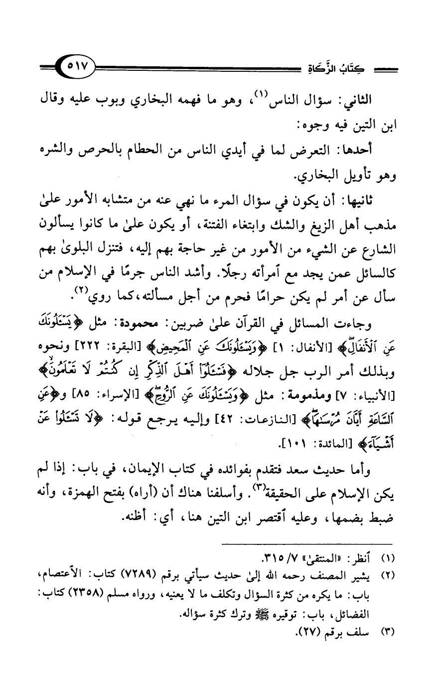 وجاءت المسائل في القرآن على ضربين: محمودة: مثل {يَسْأَلُونَكَ عَنِ الأَنْفَالِ} [الأنفال: 1] {وَيَسْأَلُونَكَ عَنِ المَحِيضِ} [البقرة: 222] ونحوه وبذلك أمر الرب جل جلاله {فَاسْأَلُوا أَهْلَ الذِّكْرِ إِنْ كُنْتُمْ لَا تَعْلَمُونَ} [الأنبياء: 7] ومذمومة: مثل {وَيَسْأَلُونَكَ عَنِ الرُّوحِ} [الإسراء: 85] {يَسْأَلُونَكَ عَنِ السَّاعَةِ أَيَّانَ مُرْسَاهَا (42)} [النازعات: 42] وإليه يرجع قوله: {لَا تَسْأَلُوا عَنْ أَشْيَاءَ} [المائدة: 101].