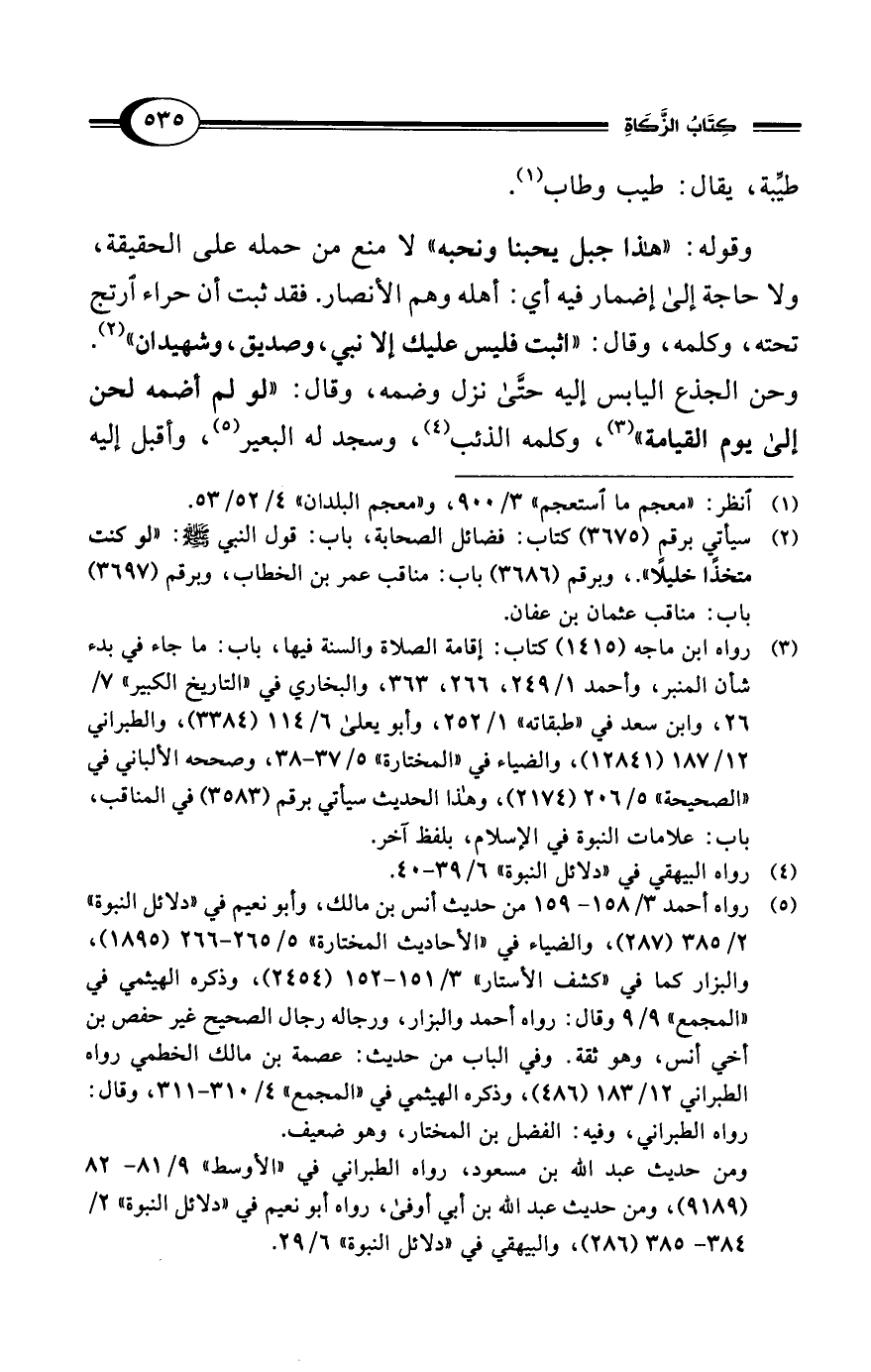 وقوله: "هذا جبل يحبنا ونحبه" لا منع من حمله على الحقيقة، ولا حاجة إلى إضمار فيه أي: أهله وهم الأنصار. فقد ثبت أن حراء ارتج تحته، وكلمه، وقال: "اثبت فلبس عليك إلا نبي، وصديق، وشهيدان " (¬2).
