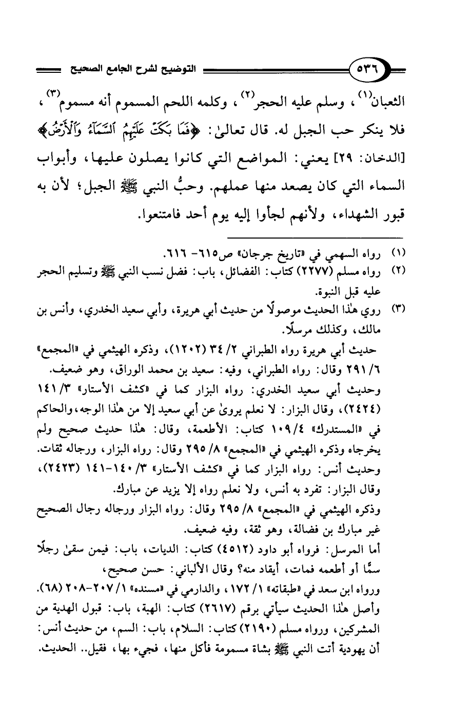 الثعبان (¬1)، وسلم عليه الحجر (¬2)، وكلمه اللحم المسموم أنه مسموم (¬3)، فلا ينكر حب الجبل له. قال تعالى: {فَمَا بَكَتْ عَلَيْهِمُ السَّمَاءُ وَالأَرْضُ} [الدخان: 29] يعني: المواضع التي كانوا يصلون عليها، وأبواب السماء التي كان يصعد منها عملهم. وحبُّ النبي - صلى الله عليه وسلم - الجبل؛ لأن به قبور الشهداء، ولأنهم لجأوا إليه يوم أحد فامتنعوا.