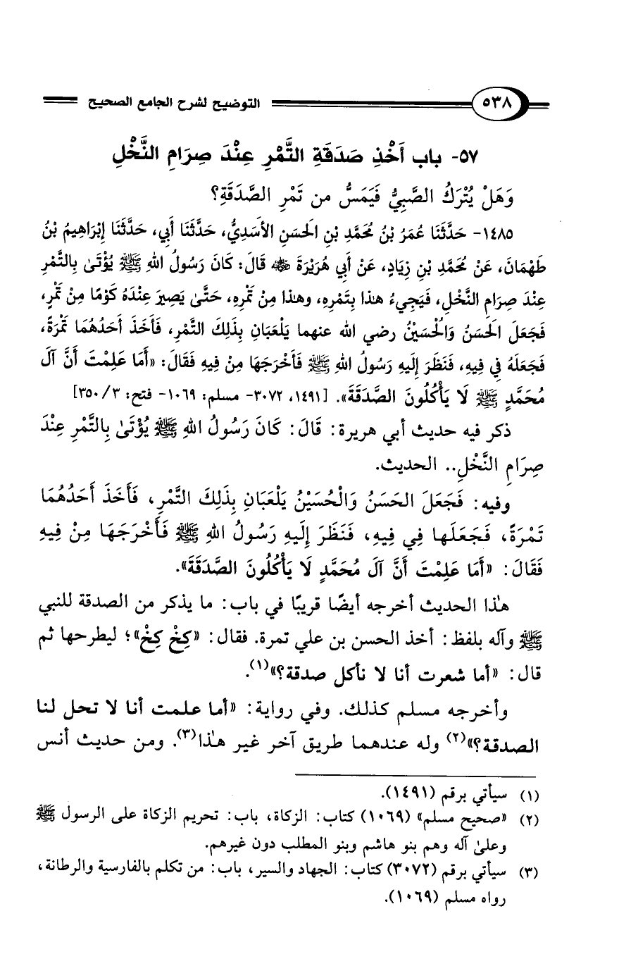1485 - حَدَّثَنَا عُمَرُ بْنُ مُحَمَّدِ بْنِ الحَسَنِ الأَسَدِيُّ، حَدَّثَنَا أَبِي، حَدَّثَنَا إِبْرَاهِيمُ بْنُ طَهْمَانَ، عَنْ مُحَمَّدِ بْنِ زِيَادٍ، عَنْ أَبِي هُرَيْرَةَ - رضي الله عنه - قَالَ: كَانَ رَسُولُ اللهِ - صلى الله عليه وسلم - يُؤْتَى بِالتَّمْرِ عِنْدَ صِرَامِ النَّخْلِ، فَيَجِيءُ هَذَا بِتَمْرِهِ، وَهَذَا مِنْ تَمْرِهِ، حَتَّى يَصِيرَ عِنْدَهُ كَوْمًا مِنْ تَمْرٍ، فَجَعَلَ الحَسَنُ وَالحُسَيْنُ رضي الله عنهما يَلْعَبَانِ بِذَلِكَ التَّمْرِ، فَأَخَذَ أَحَدُهُمَا تَمْرَةً، فَجَعَلَهَا فِي فِيهِ، فَنَظَرَ إِلَيْهِ رَسُولُ اللهِ - صلى الله عليه وسلم - فَأَخْرَجَهَا مِنْ فِيهِ فَقَالَ: "أَمَا عَلِمْتَ أَنَّ آلَ مُحَمَّدٍ - صلى الله عليه وسلم - لاَ يَأْكُلُونَ الصَّدَقَةَ". [1491، 3072 - مسلم: 1069 - فتح: 3/ 350]