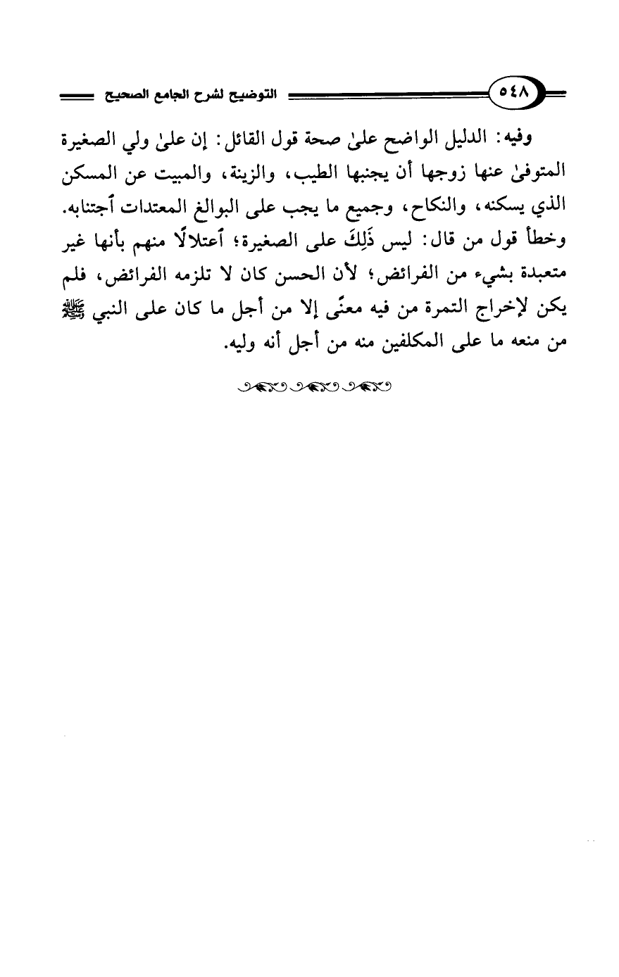 وفيه: الدليل الواضح على صحة قول القائل: إن على ولي الصغيرة المتوفى عنها زوجها أن يجنبها الطيب، والزينة، والمبيت عن المسكن الذي يسكنه، والنكاح، وجميع ما يجب على البوالغ المعتدات اجتنابه.