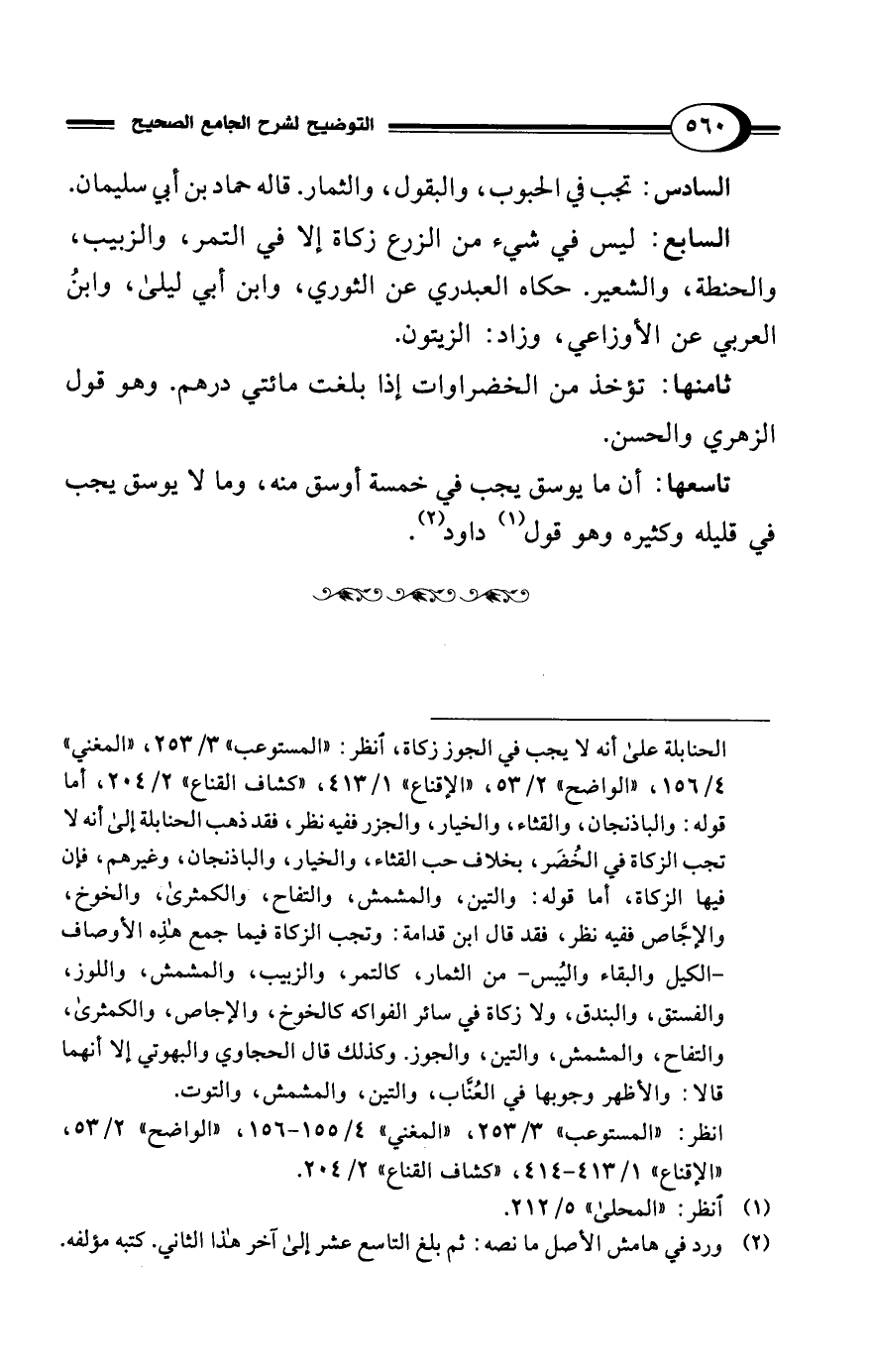 = الحنابلة على أنه لا يجب في الجوز زكاة، انظر: "المستوعب" 3/ 253، "المغني" 4/ 156، "الواضح" 2/ 53، "الإقناع" 1/ 413، "كشاف القناع" 2/ 204، أما قوله: والباذنجان، والقثاء، والخيار، والجزر ففيه نظر، فقد ذهب الحنا بلة إلى أنه لا تجب الزكاة في الخُضَر، بخلاف حب القثاء، والخيار، والباذنجان، وغيرهم، فإن فيها الزكاة، أما قوله: والتين، والمشمش، والتفاح، والكمثرى، والخوخ، والإجَّاص ففيه نظر، فقد قال ابن قدامة: وتجب الزكاة فيما جمع هذِه الأوصاف -الكيل والبقاء واليُبس- من الثمار، كالتمر، والزبيب، والمشمش، واللوز، والفستق، والبندق، ولا زكاة في سائر الفواكه كالخوخ، والإجاص، والكمثرى، والتفاح، والمشمش، والتين، والجوز. وكذلك قال الحجاوي والبهوتي إلا أنهما قالا: والأظهر وجوبها في العُنَّاب، والتين، والمشمش، والتوت.