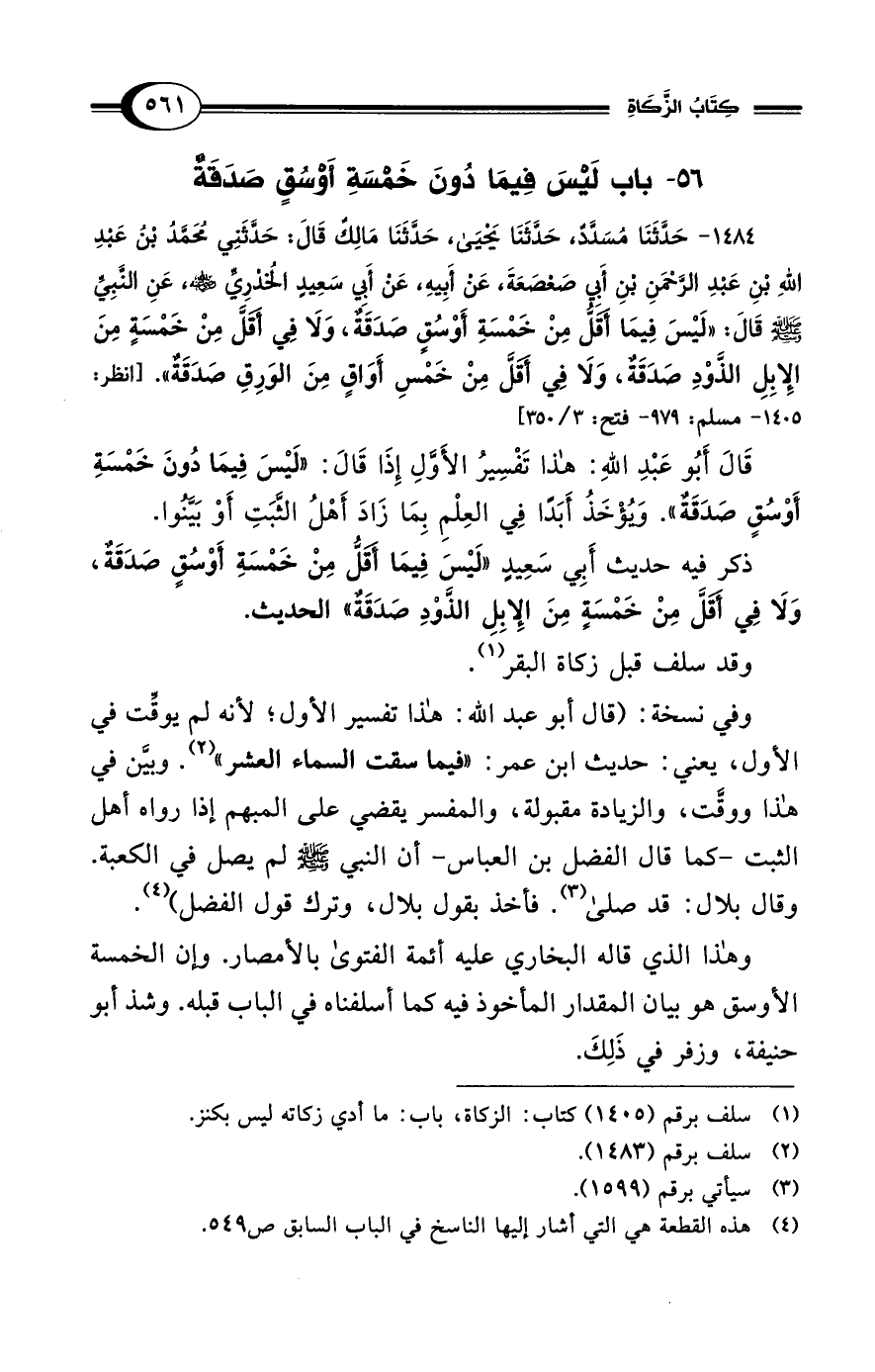 1484 - حَدَّثَنَا مُسَدَّدٌ حَدَّثَنَا يَحْيَى، حَدَّثَنَا مَالِكٌ قَالَ: حَدَّثَنِي مُحَمَّدُ بْنُ عَبْدِ اللهِ بْنِ عَبْدِ الرَّحْمَنِ بْنِ أَبِي صَعْصَعَةَ، عَنْ أَبِيهِ عَنْ أَبِي سَعِيدٍ الخُدْرِيِّ - رضي الله عنه - عَنِ النَّبِيِّ - صلى الله عليه وسلم - قَالَ: "لَيْسَ فِيمَا أَقَلُّ مِنْ خَمْسَةِ أَوْسُقٍ صَدَقَةٌ، وَلاَ فِي أَقَلَّ مِنْ خَمْسَةٍ مِنَ الإِبِلِ الذَّوْدِ صَدَقَةٌ، وَلاَ فِي أَقَلَّ مِنْ خَمْسِ أَوَاقٍ مِنَ الوَرِقِ صَدَقَةٌ". [انظر: 1405 - مسلم: 979 - فتح: 3/ 350]