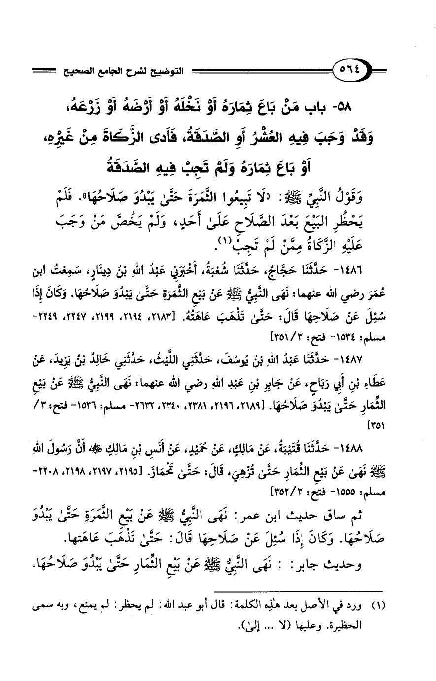 ثم ساق حديث ابن عمر: نَهَى النَّبِيُّ - صلى الله عليه وسلم - عَنْ بَيْعِ الثمَرَةِ حَتَّى يَبْدُوَ صَلَاحُهَا. وَكَانَ إِذَا سُئِلَ عَنْ صَلَاحِهَا قَالَ: حَتَّى تَذهَبَ عَاهَتها.