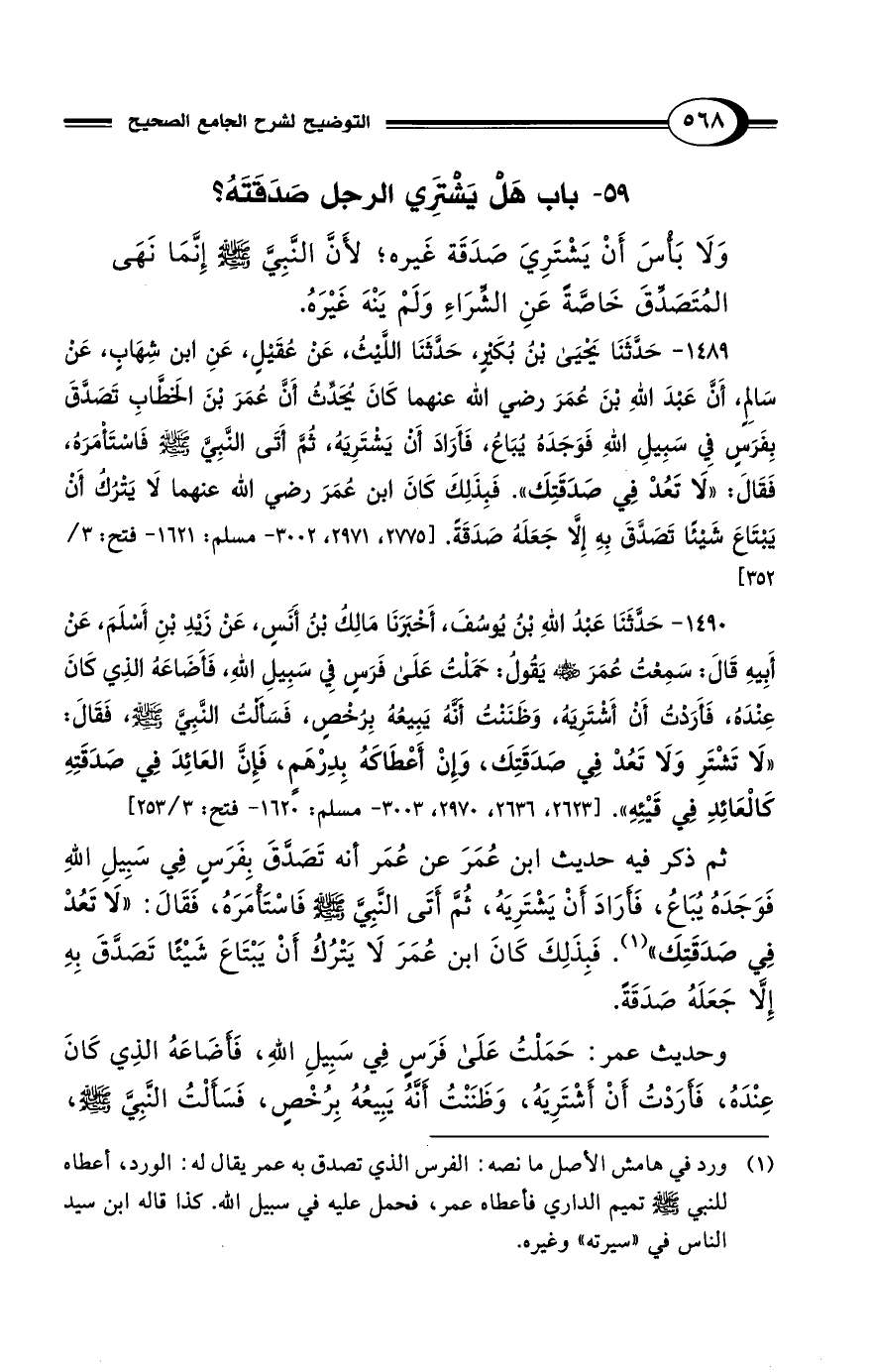 1490 - حَدَّثَنَا عَبْدُ اللهِ بْنُ يُوسُفَ، أَخْبَرَنَا مَالِكُ بْنُ أَنَسٍ، عَنْ زَيْدِ بْنِ أَسْلَمَ، عَنْ أَبِيهِ قَالَ: سَمِعْتُ عُمَرَ - رضي الله عنه - يَقُولُ: حَمَلْتُ عَلَى فَرَسٍ فِي سَبِيلِ اللهِ، فَأَضَاعَهُ الذِي كَانَ عِنْدَهُ، فَأَرَدْتُ أَنْ أَشْتَرِيَهُ، وَظَنَنْتُ أَنَّهُ يَبِيعُهُ بِرُخْصٍ، فَسَأَلْتُ النَّبِيَّ - صلى الله عليه وسلم - فَقَالَ: "لاَ تَشْتَرِ وَلاَ تَعُدْ فِي صَدَقَتِكَ، وَإِنْ أَعْطَاكَهُ بِدِرْهَمٍ، فَإِنَّ العَائِدَ فِي صَدَقَتِهِ كَالعَائِدِ فِي قَيْئِهِ". [2623، 2636، 2970، 3003 - مسلم: 1620 - فتح: 3/ 253]