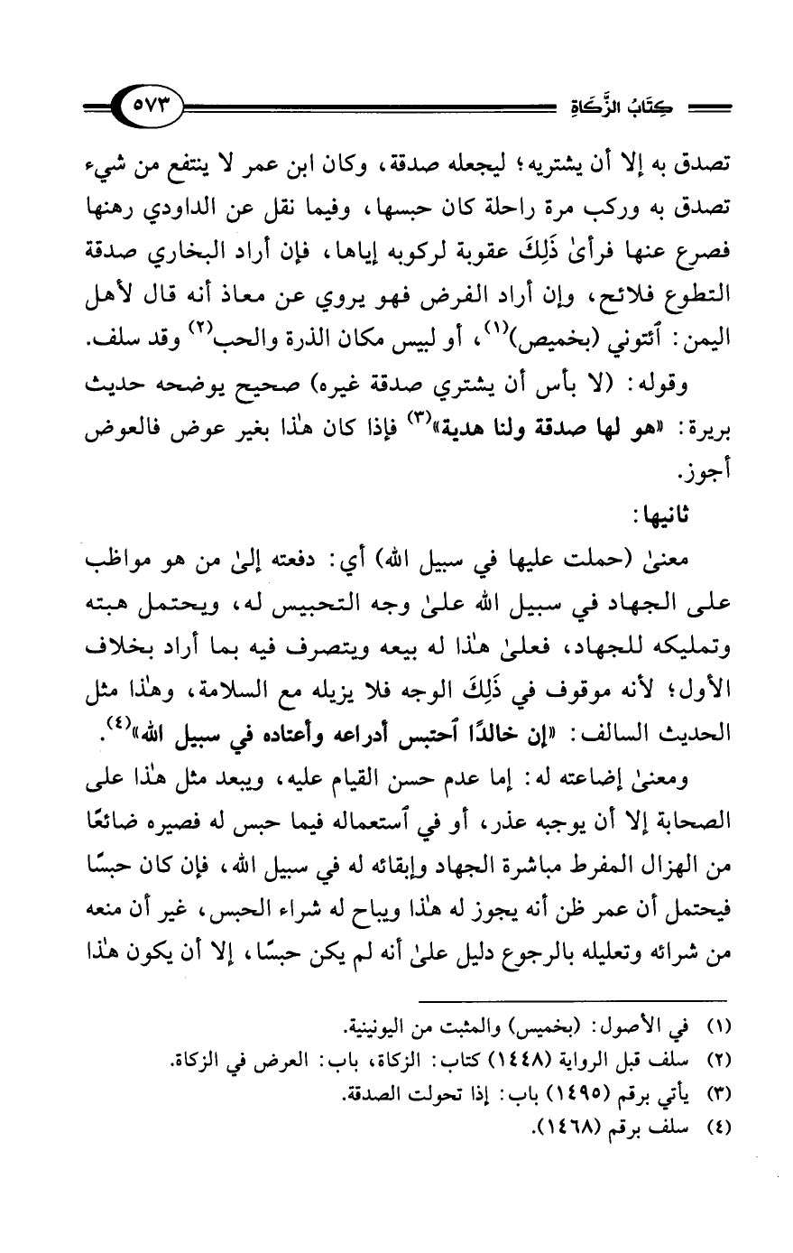 تصدق به إلا أن يشتريه؛ ليجعله صدقة، وكان ابن عمر لا ينتفع من شيء تصدق به وركب مرة راحلة كان حبسها، وفيما نقل عن الداودي رهنها فصرع عنها فرأى ذَلِكَ عقوبة لركوبه إياها، فإن أراد البخاري صدقة التطوع فلائح، وإن أراد الفرض فهو يروي عن معاذ أنه قال لأهل اليمن: ائتوني (بخميص) (¬1)، أو لبيس مكان الذرة والحب (¬2) وقد سلف.