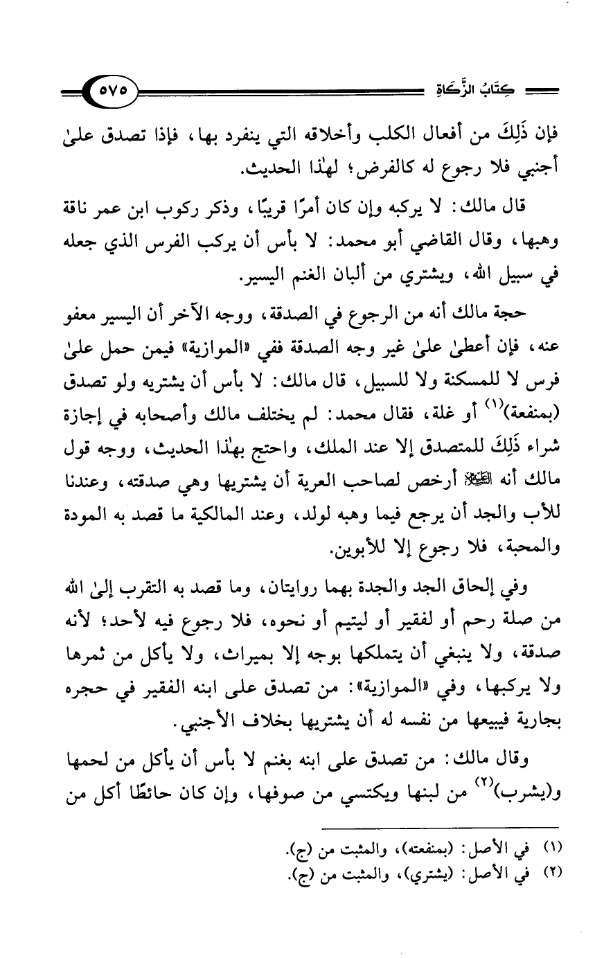 وفي إلحاق الجد والجدة بهما روايتان، وما قصد به التقرب إلى الله من صلة رحم أو لفقير أو ليتيم أو نحوه، فلا رجوع فيه لأحد؛ لأنه صدقة، ولا ينبغي أن يتملكها بوجه إلا بميراث، ولا يأكل من ثمرها ولا يركبها، وفي "الموازية": من تصدق على ابنه الفقير في حجره بجارية فيبيعها من نفسه له أن يشتريها بخلاف الأجنبي.