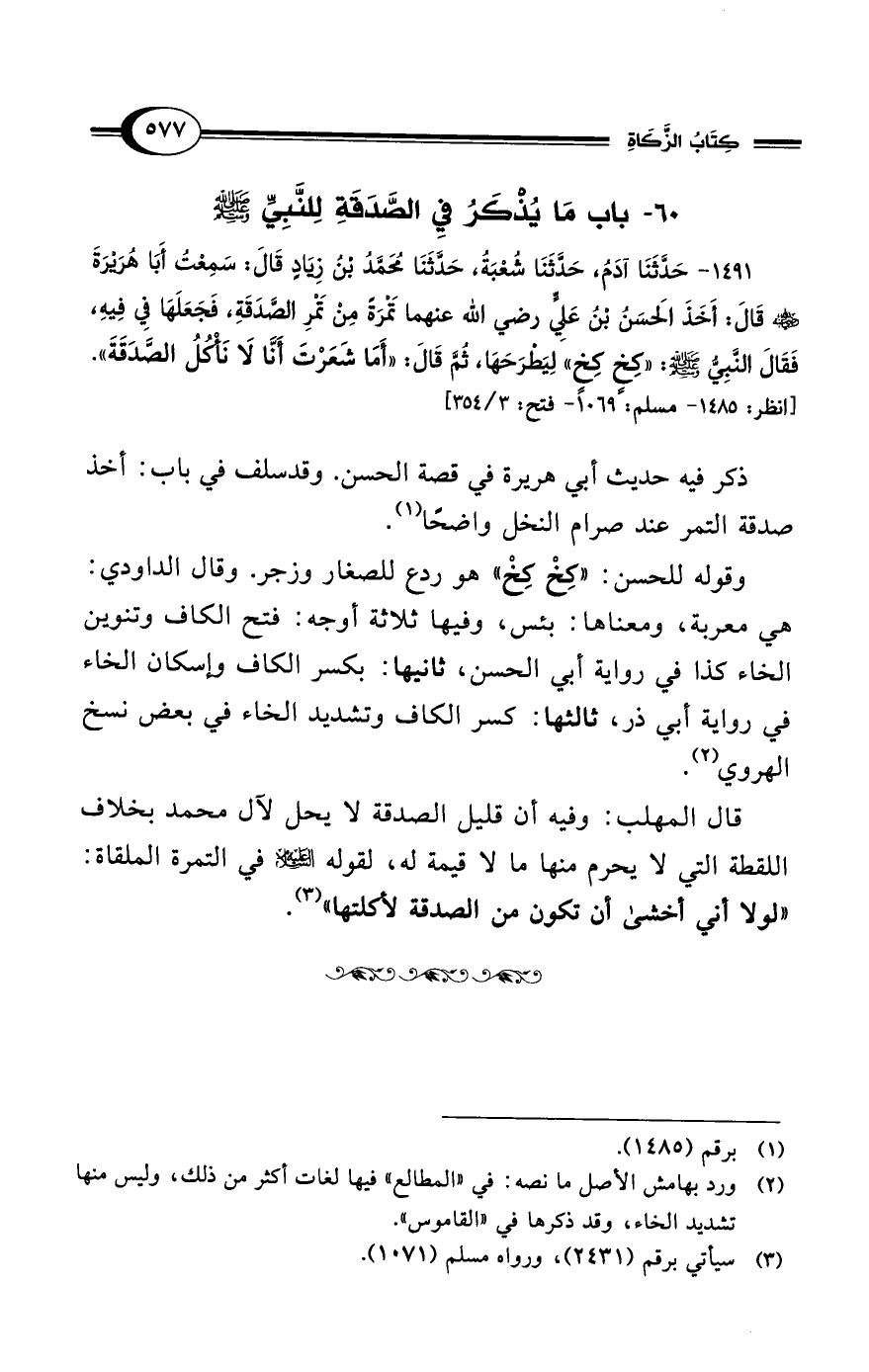 1491 - حَدَّثَنَا آدَمُ، حَدَّثَنَا شُعْبَةُ، حَدَّثَنَا مُحَمَّدُ بْنُ زِيَادٍ قَالَ: سَمِعْتُ أَبَا هُرَيْرَةَ - رضي الله عنه - قَالَ: أَخَذَ الحَسَنُ بْنُ عَلِيٍّ رضي الله عنهما تَمْرَةً مِنْ تَمْرِ الصَّدَقَةِ، فَجَعَلَهَا فِي فِيهِ، فَقَالَ النَّبِيُّ - صلى الله عليه وسلم -: "كِخٍ كِخٍ" لِيَطْرَحَهَا، ثُمَّ قَالَ: "أَمَا شَعَرْتَ أَنَّا لاَ نَأْكُلُ الصَّدَقَةَ". [انظر: 1485 - مسلم: 1069 - فتح: 3/ 354]