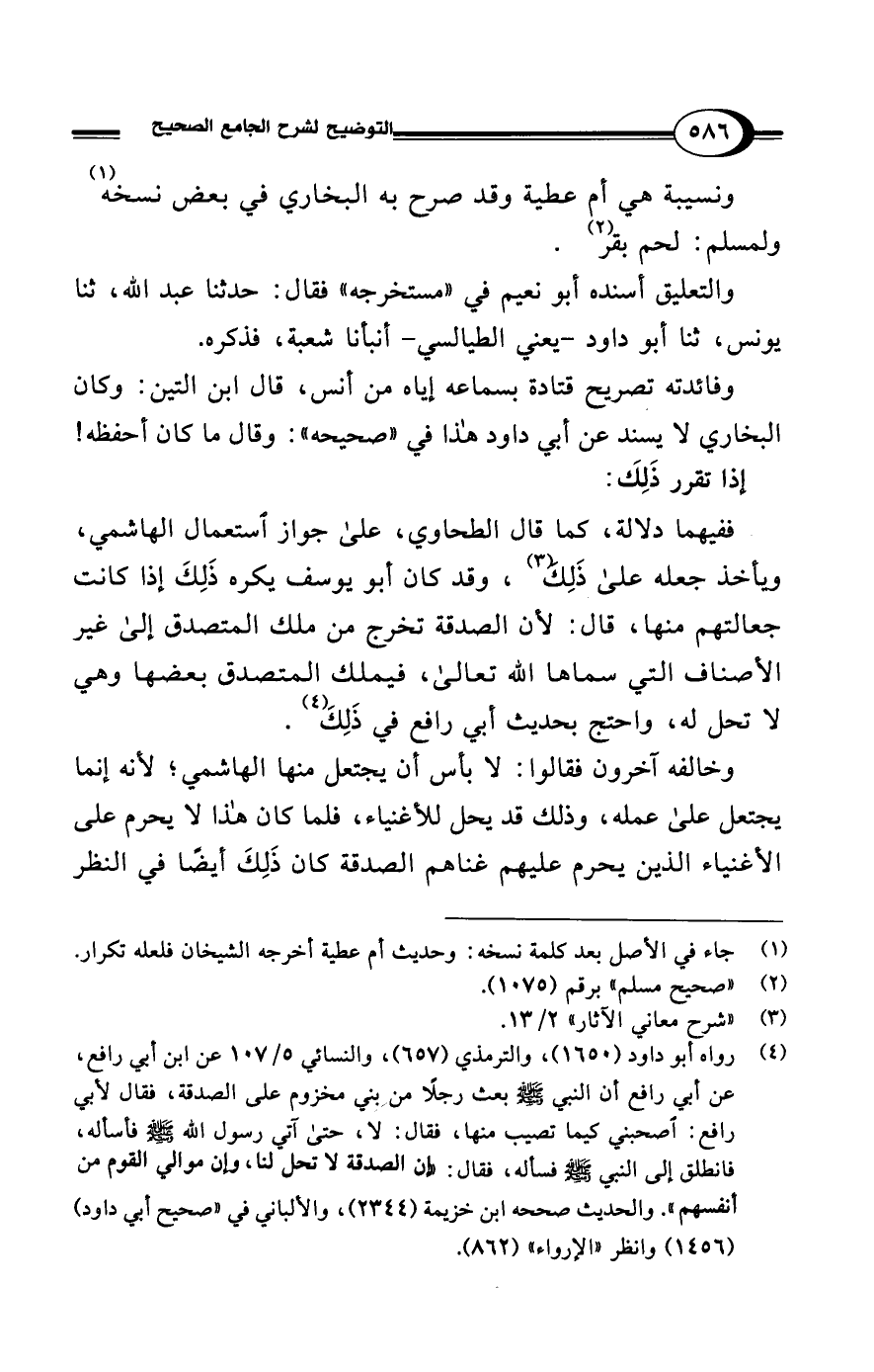 (¬4) رواه أبو داود (1650)، والترمذي (657)، والنسائي 5/ 107 عن ابن أبي رافع، عن أبي رافع أن النبي - صلى الله عليه وسلم - بعث رجلًا من بني مخزوم على الصدقة، فقال لأبي رافع: اصحبني كيما تصيب منها، فقال: لا، حتى آتي رسول الله - صلى الله عليه وسلم - فأسأله، فانطلق إلى النبي - صلى الله عليه وسلم - فسأله، فقال: "إن الصدقة لا تحل لنا، وإن موالي القوم من أنفسهم". والحديث صححه ابن خزيمة (2344)، والألباني في "صحيح أبي داود" (1456) وانظر "الإرواء" (862).