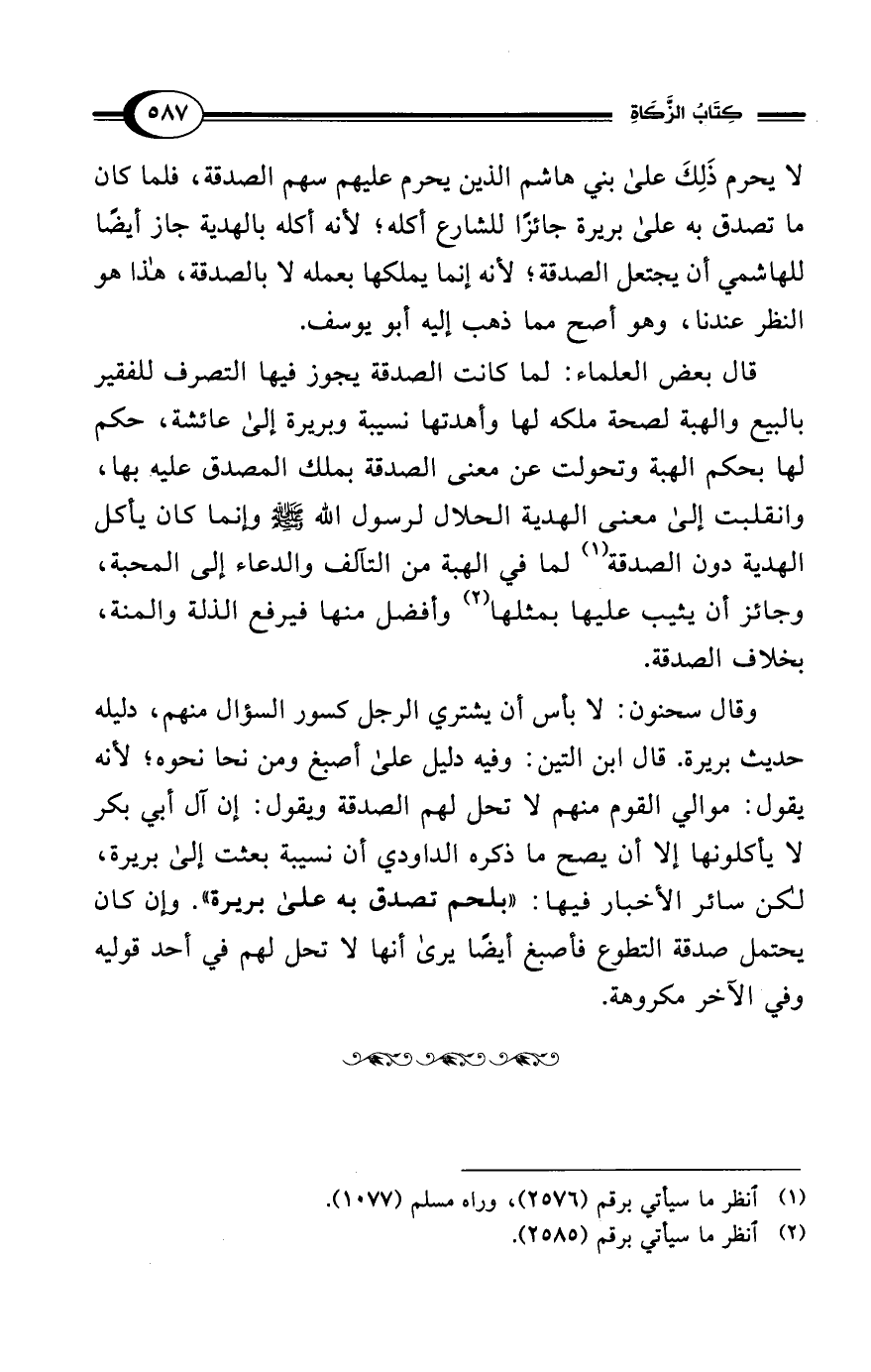 وقال سحنون: لا بأس أن يشتري الرجل كسور السؤال منهم، دليله حديث بريرة. قال ابن التين: وفيه دليل على أصبغ ومن نحا نحوه؛ لأنه يقول: موالي القوم منهم لا تحل لهم الصدقة ويقول: إن آل أبي بكر لا يأكلونها إلا أن يصح ما ذكره الداودي أن نسيبة بعثت إلى بريرة، لكن سائر الأخبار فيها: "بلحم تصدق به على بريرة". وإن كان يحتمل صدقة التطوع فأصبغ أيضًا يرى أنها لا تحل لهم في أحد قوليه وفي الآخر مكروهة.