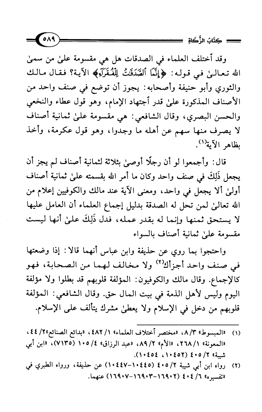 واحتجوا بما روي عن حذيفة وابن عباس أنهما قالا: إذا وضعتها في صنف واحد أجزأك (¬2) ولا مخالف لهما من الصحابة، فهو كالإجماع. وقال مالك والكوفيون: المؤلفة قلوبهم قد بطلوا ولا مؤلفة اليوم وليس لأهل الذمة في بيت المال حق. وقال الشافعي: المؤلفة قلوبهم من دخل في الإسلام ولا يعطى مشرك يتألف على الإسلام.