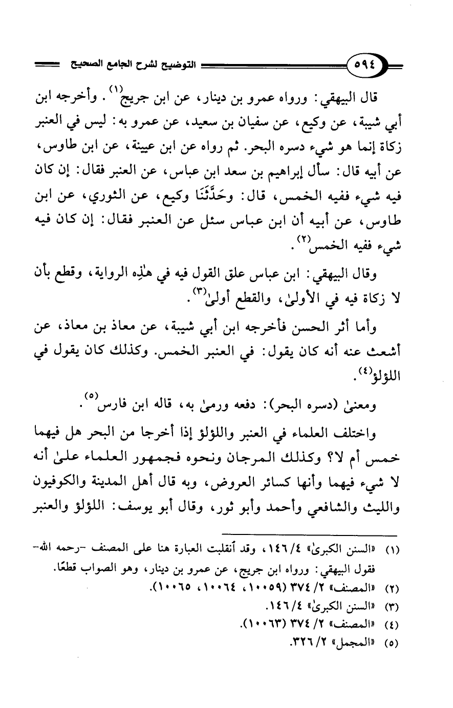 قال البيهقي: ورواه عمرو بن دينار، عن ابن جريج (¬1). وأخرجه ابن أبي شيبة، عن وكيع، عن سفيان بن سعيد، عن عمرو به: ليس في العنبر زكاة إنما هو شيء دسره البحر. ثم رواه عن ابن عيينة، عن ابن طاوس، عن أبيه قال: سأل إبراهيم بن سعد ابن عباس، عن العنبر فقال: إن كان فيه شيء ففيه الخمس، قال: وحَدَّثَنَا وكيع، عن الثوري، عن ابن طاوس، عن أبيه أن ابن عباس سئل عن العنبر فقال: إن كان فيه شيء ففيه الخمس (¬2).