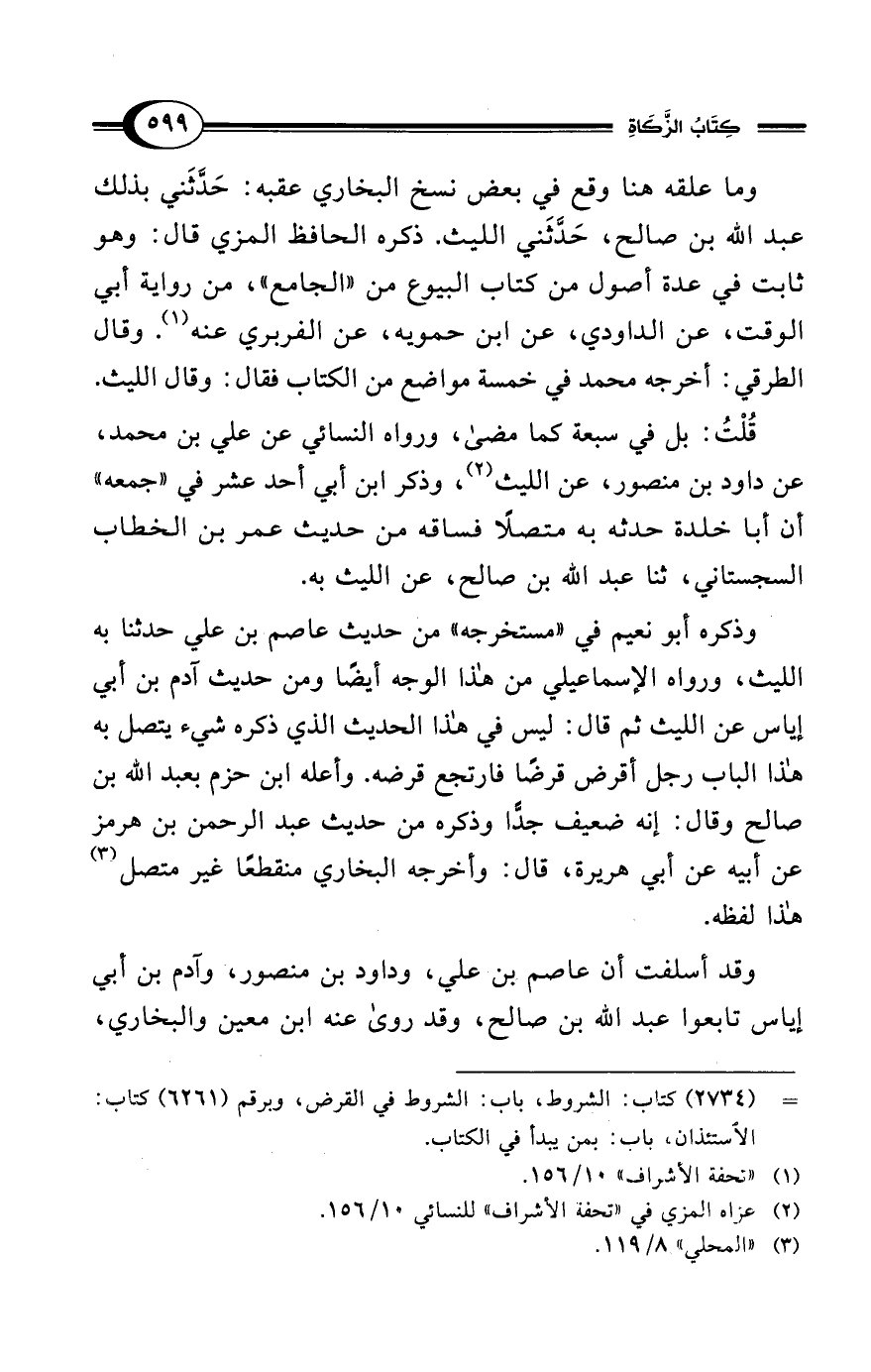 وذكره أبو نعيم في "مستخرجه" من حديث عاصم بن علي حدثنا به الليث، ورواه الإسماعيلي من هذا الوجه أيضًا ومن حديث آدم بن أبي إياس عن الليث ثم قال: ليس في هذا الحديث الذي ذكره شيء يتصل به هذا الباب رجل أقرض قرضًا فارتجع قرضه. وأعله ابن حزم بعبد الله بن صالح وقال: إنه ضعيف جدًّا وذكره من حديث عبد الرحمن بن هرمز عن أبيه عن أبي هريرة، قال: وأخرجه البخاري منقطعًا غير متصل (¬3) هذا لفظه.