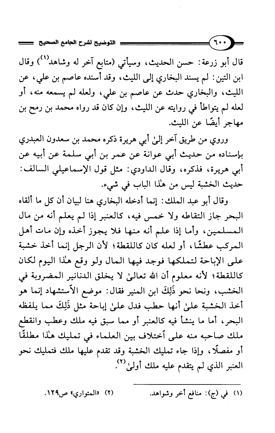 وقال أبو عبد الملك: إنما أدخله البخاري هنا لبيان أن كل ما ألقاه البحر جاز التقاطه ولا خمس فيه، كالعنبر إذا لم يعلم أنه من مال المسلمين، وأما إذا علم أنه منها فلا يجوز أخذه وإن مات أهل المركب عطشًا، أو لعله كان كاللقطة؛ لأن الرجل إنما أخذ خشبة على الإباحة لتملكها فوجد فيها المال ولو وقع هذا اليوم لكان كاللقطة؛ لأنه معلوم أن الله تعالى لا يخلق الدنانير المضروبة في الخشب، ونحا نحو ذَلِكَ ابن المنير فقال: موضع الاستشهاد إنما هو أخذ الخشبة على أنها حطب فدل على إباحة مثل ذَلِكَ مما يلفظه البحر، أما ما ينشأ فيه كالعنبر أو مما سبق فيه ملك وعطب وانقطع ملك صاحبه منه على اختلاف بين العلماء في تمليك هذا مطلقًا أو مفصلًا، وإذا جاء تمليك الخشبة وقد تقدم عليها ملك فتمليك نحو العنبر الذي لم يتقدم عليه ملك أولى (¬2).