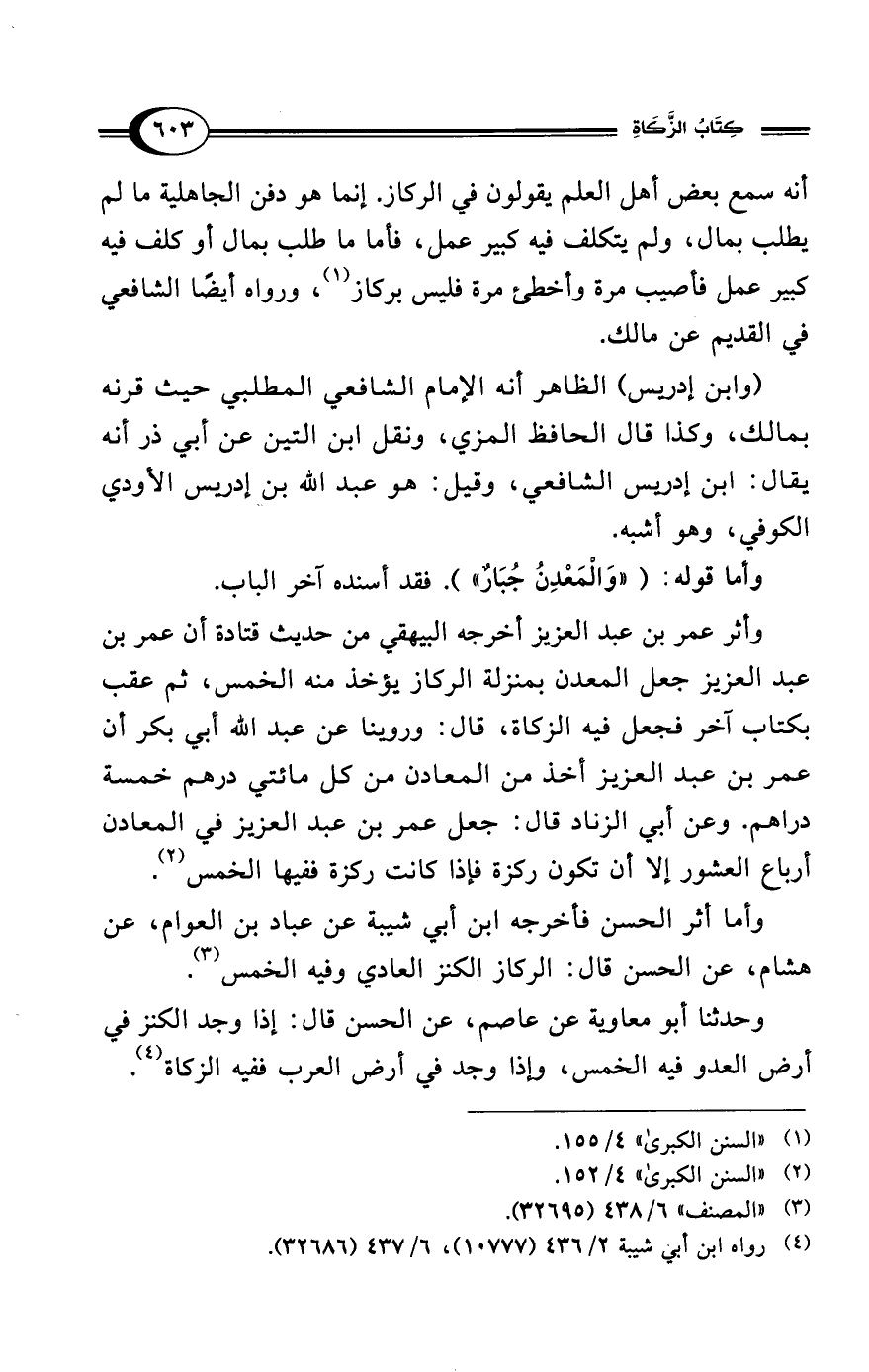 وأثر عمر بن عبد العزيز أخرجه البيهقي من حديث قتادة أن عمر بن عبد العزيز جعل المعدن بمنزلة الركاز يؤخذ منه الخمس، ثم عقب بكتاب آخر فجعل فيه الزكاة، قال: وروينا عن عبد الله أبي بكر أن عمر بن عبد العزيز أخذ من المعادن من كل مائتي درهم خمسة دراهم. وعن أبي الزناد قال: جعل عمر بن عبد العزيز في المعادن أرباع العشور إلا أن تكون ركزة فإذا كانت ركزة ففيها الخمس (¬2).