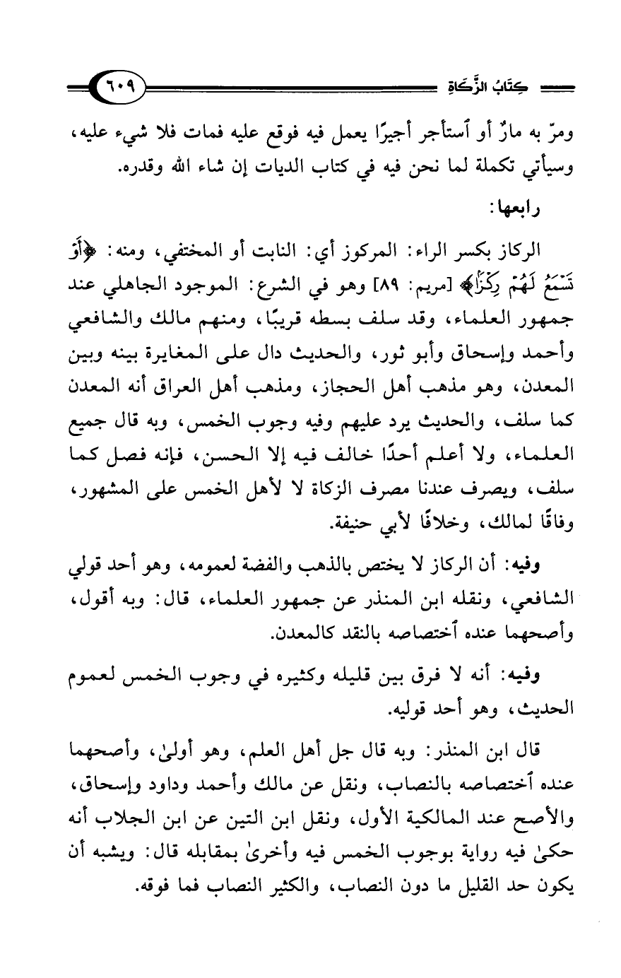الركاز بكسر الراء: المركوز أي: النابت أو المختفي، ومنه: {أَوْ تَسْمَعُ لَهُمْ رِكْزًا} [مريم: 89] وهو في الشرع: الموجود الجاهلي عند جمهور العلماء، وقد سلف بسطه قريبًا، ومنهم مالك والشافعي وأحمد وإسحاق وأبو ثور، والحديث قال على المغايرة بينه وبين المعدن، وهو مذهب أهل الحجاز، ومذهب أهل العراق أنه المعدن كما سلف، والحديث يرد عليهم وفيه وجوب الخمس، وبه قال جميع العلماء، ولا أعلم أحدًا خالف فيه إلا الحسن، فإنه فصل كما سلف، ويصرف عندنا مصرف الزكاة لا لأهل الخمس على المشهور، وفاقًا لمالك، وخلافًا لأبي حنيفة.