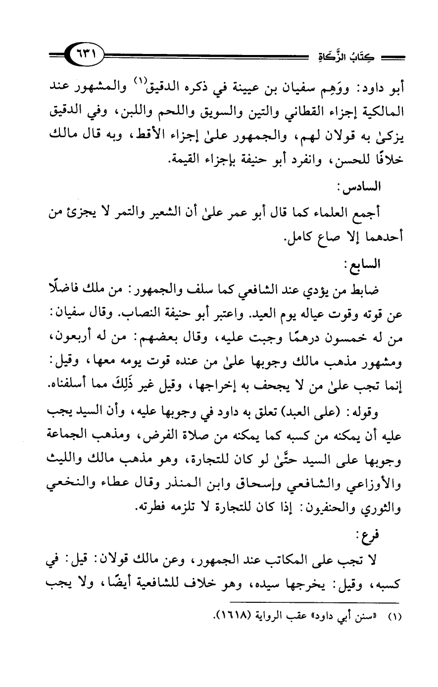 أبو داود: ووَهِم سفيان بن عيينة في ذكره الدقيق (¬1) والمشهور عند المالكية إجزاء القطاني والتين والسويق واللحم واللبن، وفي الدقيق يزكى به قولان لهم، والجمهور على إجزاء الأقط، وبه قال مالك خلافًا للحسن، وانفرد أبو حنيفة بإجزاء القيمة.