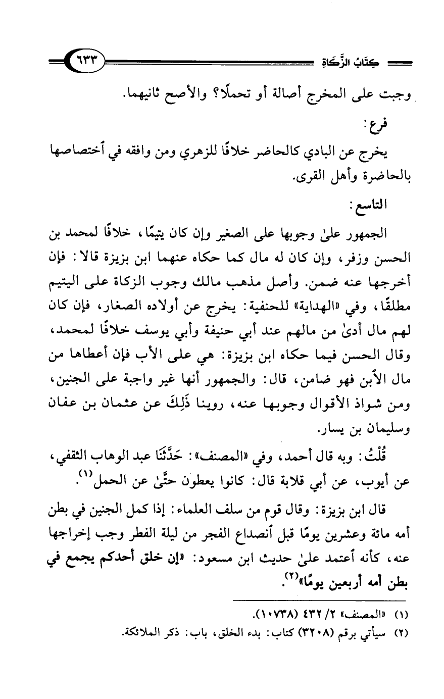 الجمهور على وجوبها على الصغير وإن كان يتيمًا، خلافًا لمحمد بن الحسن وزفر، وإن كان له مال كما حكاه عنهما ابن بزيزة قالا: فإن أخرجها عنه ضمن. وأصل مذهب مالك وجوب الزكاة على اليتيم مطلقًا، وفي "الهداية" للحنفية: يخرج عن أولاده الصغار، فإن كان لهم مال أدى من مالهم عند أبي حنيفة وأبي يوسف خلافًا لمحمد، وقال الحسن فيما حكاه ابن بزيزة: هي على الأب فإن أعطاها من مال الابن فهو ضامن، قال: والجمهور أنها غير واجبة على الجنين، ومن شواذ الأقوال وجوبها عنه، روينا ذَلِكَ عن عثمان بن عفان وسليمان بن يسار.