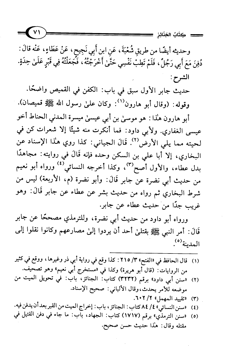 (¬5) "سنن الترمذي" برقم (1717) كتاب: الجهاد، باب: ما جاء في دفن القتيل في مقتله وقال: هذا حديث حسن صحيح.