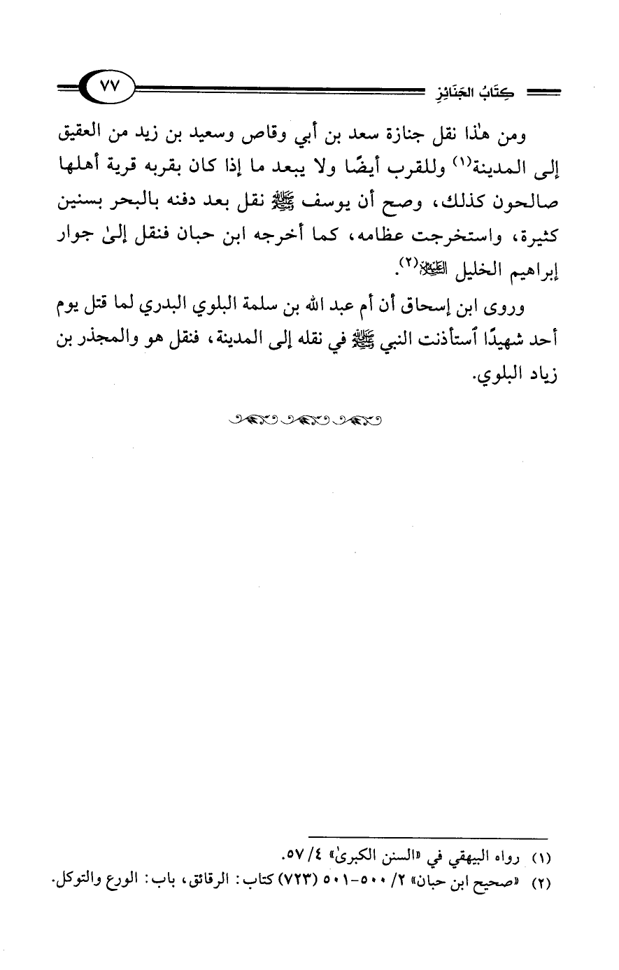 ومن هذا نقل جنازة سعد بن أبي وقاص وسعيد بن زيد من العقيق إلى المدينة (¬1) وللقرب أيضًا ولا يبعد ما إذا كان بقربه قرية أهلها صالحون كذلك، وصح أن يوسف - صلى الله عليه وسلم - نقل بعد دفنه بالبحر بسنين كثيرة، واستخرجت عظامه، كما أخرجه ابن حبان فنقل إلى جوار إبراهيم الخليل - عليه السلام - (¬2).