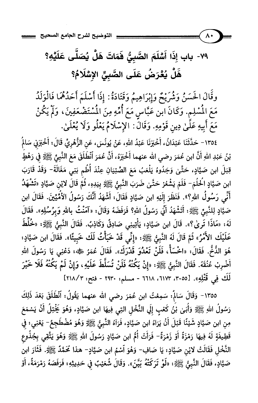 79 - باب إِذَا أَسْلَمَ الصَّبِيُّ فَمَاتَ هَلْ يُصَلَّى عَلَيْهِ؟ وَهَلْ يُعْرَضُ عَلَى الصَّبِيِّ الإِسْلاَمُ؟