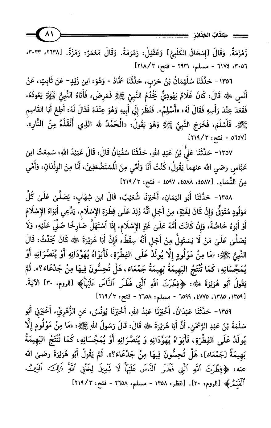 1358 - حَدَّثَنَا أَبُو اليَمَانِ، أَخْبَرَنَا شُعَيْبٌ، قَالَ ابْنُ شِهَابٍ: يُصَلَّى عَلَى كُلِّ مَوْلُودٍ مُتَوَفًّى وَإِنْ كَانَ لِغَيَّةٍ؛ مِنْ أَجْلِ أَنَّهُ وُلِدَ عَلَى فِطْرَةِ الإِسْلاَمِ، يَدَّعِي أَبَوَاهُ الإِسْلاَمَ أَوْ أَبُوهُ خَاصَّةً، وَإِنْ كَانَتْ أُمُّهُ عَلَى غَيْرِ الإِسْلاَمِ، إِذَا اسْتَهَلَّ صَارِخًا صُلِّيَ عَلَيْهِ، وَلاَ يُصَلَّى عَلَى مَنْ لاَ يَسْتَهِلُّ مِنْ أَجْلِ أَنَّهُ سِقْطٌ، فَإِنَّ أَبَا هُرَيْرَةَ - رضي الله عنه - كَانَ يُحَدِّثُ: قَالَ النَّبِيُّ - صلى الله عليه وسلم -: "مَا مِنْ مَوْلُودٍ إِلاَّ يُولَدُ عَلَى الفِطْرَةِ، فَأَبَوَاهُ يُهَوِّدَانِهِ أَوْ يُنَصِّرَانِهِ أَوْ يُمَجِّسَانِهِ، كَمَا تُنْتَجُ البَهِيمَةُ بَهِيمَةً جَمْعَاء، هَلْ تُحِسُّونَ فِيهَا مِنْ جَدْعَاءَ؟ ". ثُمَّ يَقُولُ أَبُو هُرَيْرَةَ - رضي الله عنه -: {فِطْرَتَ اللَّهِ الَّتِي فَطَرَ النَّاسَ عَلَيْهَا} [الروم: 30] الآيَةَ. [1359، 1385، 4775، 6599 - مسلم: 2658 - فتح: 3/ 219]