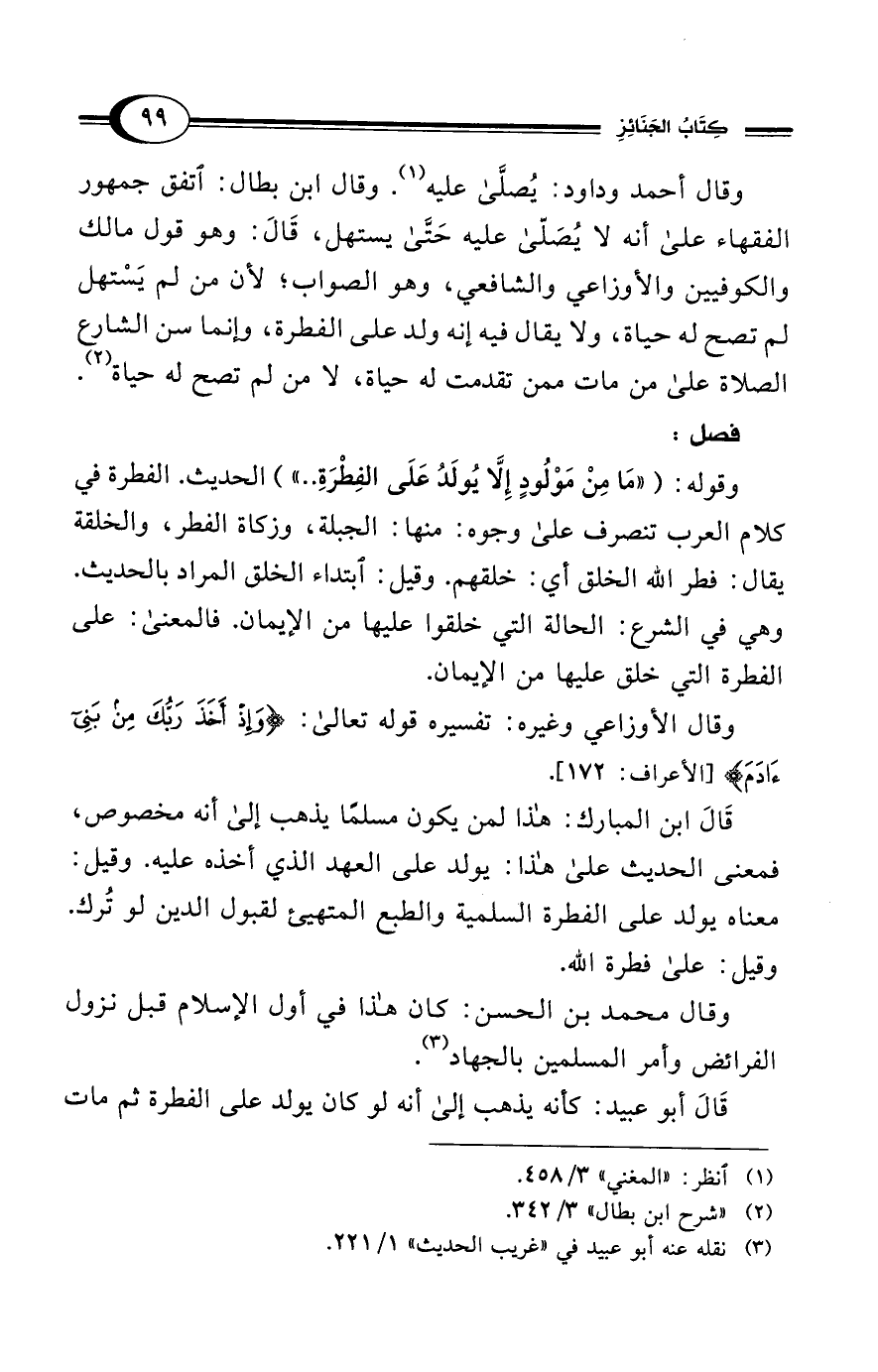 وقولى: ("مَا مِنْ مَوْلُودٍ إِلَّا يُولَدُ عَلَى الفِطْرَةِ .. ") الحديث. الفطرة في كلام العرب تنصرف على وجوه: منها: الجبلة، وزكاة الفطر، والخلقة يقال: فطر الله الخلق أي: خلقهم. وقيل: ابتداء الخلق المراد بالحديث.
