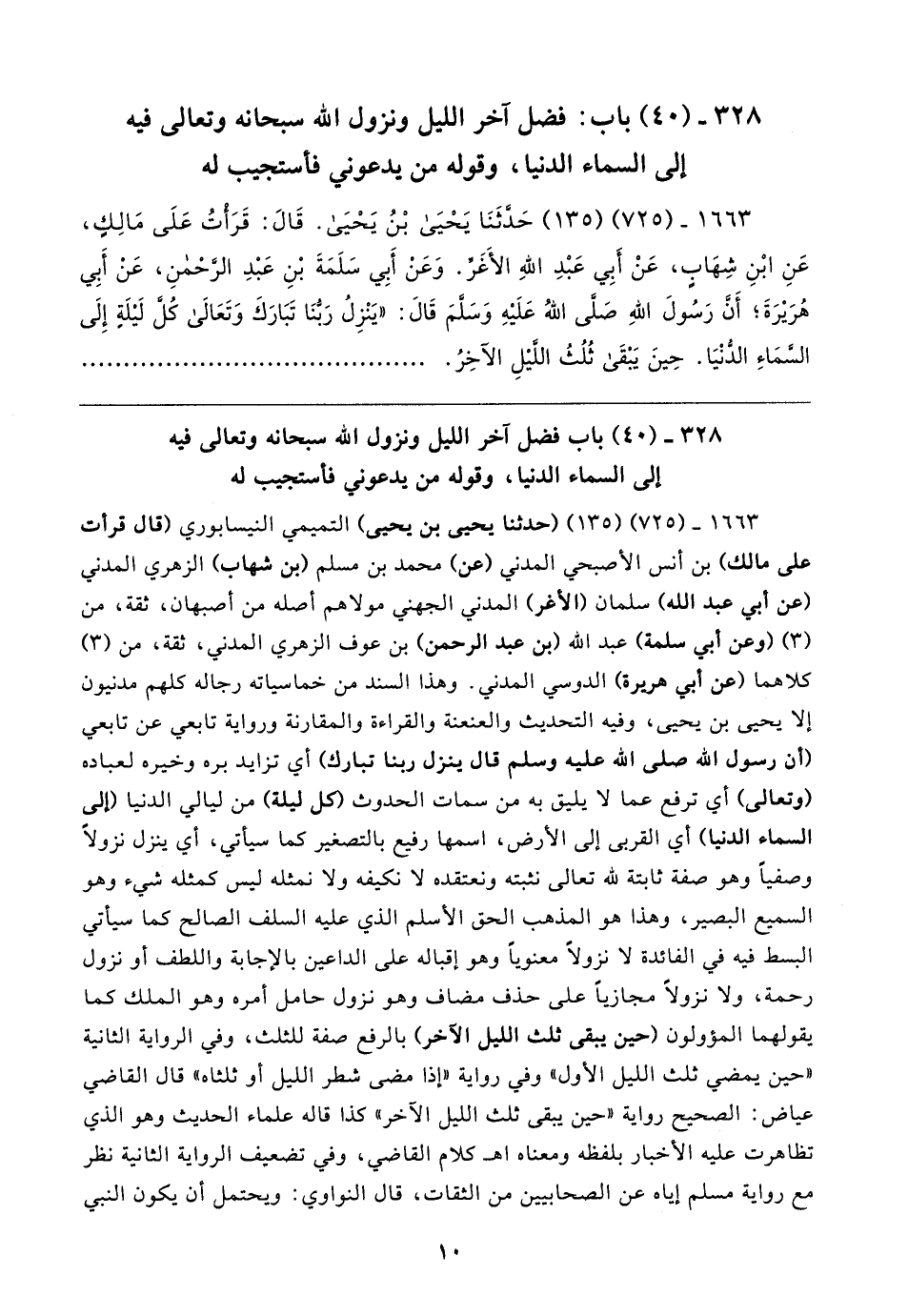 ١٦٦٣ - (٧٢٥) (١٣٥) (حدثنا يحيى بن يحيى) التميمي النيسابوري (قال قرأت على مالك) بن أنس الأصبحي المدني (عن) محمد بن مسلم (بن شهاب) الزهري المدني (عن أبي عبد الله) سلمان (الأغر) المدني الجهني مولاهم أصله من أصبهان، ثقة، من (٣) (وعن أبي سلمة) عبد الله (بن عبد الرحمن) بن عوف الزهري المدني، ثقة، من (٣) كلاهما (عن أبي هريرة) الدوسي المدني. وهذا السند من خماسياته رجاله كلهم مدنيون إلا يحيى بن يحيى، وفيه التحديث والعنعنة والقراءة والمقارنة ورواية تابعي عن تابعي (أن رسول الله صلى الله عليه وسلم قال ينزل ربنا تبارك) أي تزايد بره وخيره لعباده (وتعالى) أي ترفع عما لا يليق به من سمات الحدوث كل ليلة) من ليالي الدنيا (إلى السماه الدنيا) أي القربى إلى الأرض، اسمها رفيع بالتصغير كما سيأتي، أي ينزل نزولًا وصفيًا وهو صفة ثابتة لله تعالى نثبته ونعتقده لا نكيفه ولا نمثله ليس كمثله شيء وهو السميع البصير، وهذا هو المذهب الحق الأسلم الذي عليه السلف الصالح كما سيأتي البسط فيه في الفائدة لا نزولًا معنويًا وهو إقباله على الداعين بالإجابة واللطف أو نزول رحمة، ولا نزولًا مجازيًا على حذف مضاف وهو نزول حامل أمره وهو الملك كما يقولهما المؤولون (حين يبقى ثلث الليل الآخر) بالرفع صفة للثلث، وفي الرواية الثانية "حين يمضي ثلث الليل الأول" وفي رواية "إذا مضى شطر الليل أو ثلثاه" قال القاضي عياض: الصحيح رواية "حين يبقى ثلث الليل الآخر" كذا قاله علماء الحديث وهو الذي تظاهرت عليه الأخبار بلفظه ومعناه اهـ كلام القاضي، وفي تضعيف الرواية الثانية نظر مع رواية مسلم إياه عن الصحابيين من الثقات، قال النواوي: ويحتمل أن يكون النبي