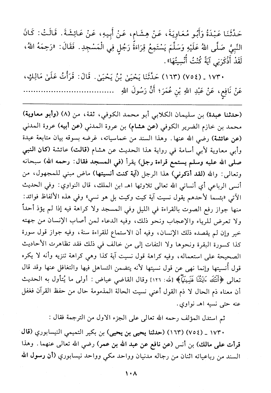 حَدَّثَنَا عَبْدَةُ وَأَبُو مُعَاويَةَ، عَنْ هِشَامٍ، عَنْ أَبِيهِ، عَنْ عَائِشَةَ. قَالتْ: كَانَ النَّبِيُّ صَلَّى اللهُ عَلَيهِ وَسَلَّمَ يَسْتَمِعُ قِرَاءَةَ رَجُلٍ في الْمَسْجِدِ. فَقَال: "رَحِمَهُ اللهُ، لَقَدْ أَذْكَرَنِي آيَة كُنْتُ أُنْسِيتُهَا".