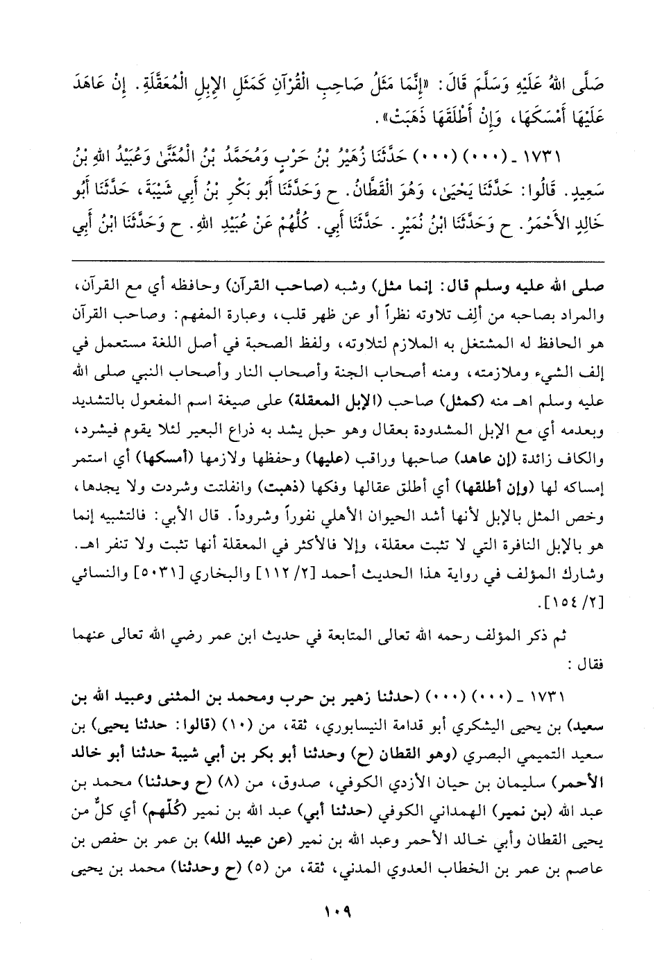 صَلَّى اللهُ عَلَيهِ وَسَلَّمَ قَال: "إِنمَا مَثَلُ صَاحِبِ الْقُرْآنِ كَمَثَلِ الإِبِلِ الْمُعَقَّلَةِ. إِنْ عَاهَدَ عَلَيهَا أَمْسَكَهَا، وَإِنْ أَطْلَقَهَا ذَهَبَتْ".
