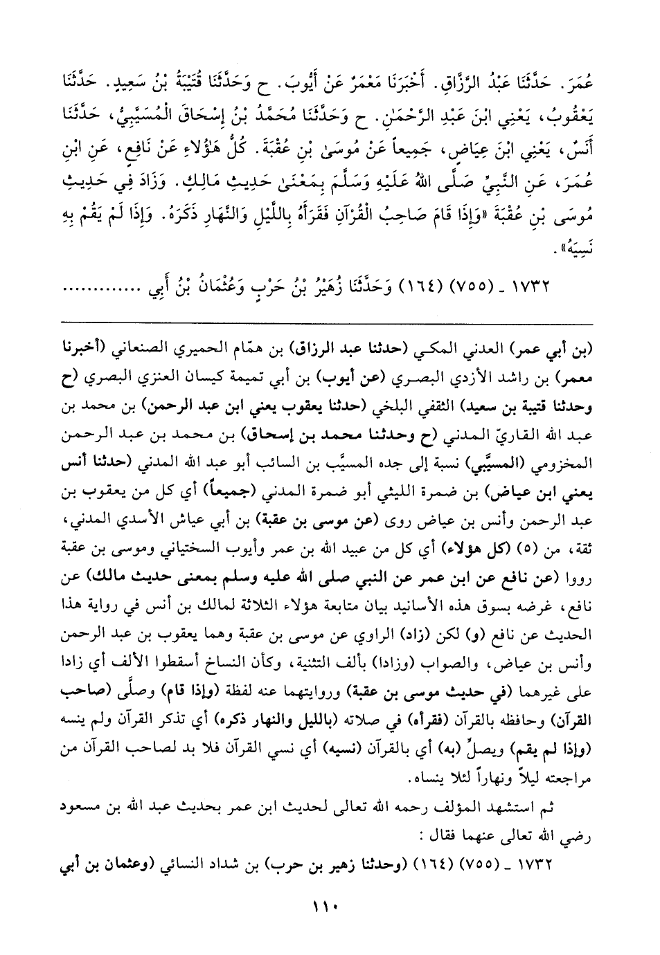 عُمَرَ. حَدَّثَنَا عَبْدُ الرَّزاقِ. اخبَرَنَا مَعْمَر عَن أَيُّوبَ. ح وَحدَّثَنَا قُتَيبَةُ بْنُ سَعِيدٍ. حَدَّثَنَا يَعْقُوبُ، يَعْنِي ابْنَ عَبْدِ الرَّحْمَنِ. ح وَحدَّثَنَا مُحَمَّدُ بْنُ إِسْحَاقَ الْمُسَيِّبِي، حَدَّثَنَا أَنَسٌ، يَعْنِي ابْنَ عِيَاضٍ، جَمِيعًا عَنْ مُوسَى بْنِ عُقْبَةَ. كُلُّ هَؤُلاءِ عَنْ نَافِعٍ، عَنِ ابْنِ عُمَرَ، عَنِ النَّبِيِّ صلَّى اللهُ عَلَيهِ وَسَلَّمَ بِمَعْنَى حَدِيثِ مَالِكٍ. وَزَادَ في حَدِيثِ مُوسَى بْنِ عُقْبَةَ "وَإِذَا قَامَ صَاحِبُ الْقُرْآنِ فَقَرَأَهُ بِاللَّيلِ وَالنَّهَارِ ذَكَرَهُ. وَإِذَا لَمْ يَقُمْ بِهِ نَسِيَهُ".