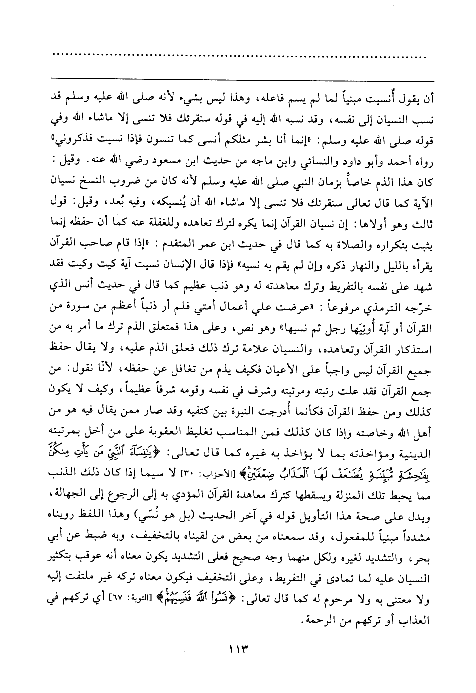 أن يقول أُنسيت مبنيًّا لما لم يسم فاعله، وهذا ليس بشيء لأنه صلى الله عليه وسلم قد نسب النسيان إلى نفسه، وقد نسبه الله إليه في قوله سنقرئك فلا تنسى إلَّا ماشاء الله وفي قوله صلى الله عليه وسلم! "إنما أنا بشر مثلكم أنسى كما تنسون فإذا نسيت فذكروني" رواه أحمد وأبو داود والنسائي وابن ماجة من حديث ابن مسعود رضي الله عنه. وقيل: كان هذا الذم خاصًّا بزمان النبي صلى الله عليه وسلم لأنه كان من ضروب النسخ نسيان الآية كما قال تعالى سنقرئك فلا تنسى إلَّا ماشاء الله أن يُنسيكه، وفيه بُعد، وقيل: قول ثالث وهو أولاها: إن نسيان القرآن إنما يكره لترك تعاهده وللغفلة عنه كما أن حفظه إنما يثبت بتكراره والصلاة به كما قال في حديث ابن عمر المتقدم: "إذا قام صاحب القرآن يقرأه بالليل والنهار ذكره وإن لم يقم به نسيه" فإذا قال الإنسان نسيت آية كيت وكيت فقد شهد على نفسه بالتفريط وترك معاهدته له وهو ذنب عظيم كما قال في حديث أنس الَّذي خرَّجه الترمذي مرفوعًا: "عرضت علي أعمال أمتي فلم أر ذنبًا أعظم من سورة من القرآن أو آية أُوتِيَها رجل ثم نسيها" وهو نص، وعلى هذا فمتعلق الذم ترك ما أمر به من استذكار القرآن وتعاهده، والنسيان علامة ترك ذلك فعلق الذم عليه، ولا يقال حفظ جميع القرآن ليس واجبًا على الأعيان فكيف يذم من تغافل عن حفظه، لأنّا نقول: من جمع القرآن فقد علت رتبته ومرتبته وشرف في نفسه وقومه شرفًا عظيمًا، وكيف لا يكون كذلك ومن حفظ القرآن فكأنما أُدرجت النبوة بين كتفيه وقد صار ممن يقال فيه هو من أهل الله وخاصته وإذا كان كذلك فمن المناسب تغليظ العقوبة على من أخل بمرتبته الدينية ومؤاخذته بما لا يؤاخذ به غيره كما قال تعالى: {يَانِسَاءَ النَّبِيِّ مَنْ يَأْتِ مِنْكُنَّ بِفَاحِشَةٍ مُبَيِّنَةٍ يُضَاعَفْ لَهَا الْعَذَابُ ضِعْفَينِ} [الأحزاب: ٣٠] لا سيما إذا كان ذلك الذنب مما يحبط تلك المنزلة ويسقطها كترك معاهدة القرآن المؤدي به إلى الرجوع إلى الجهالة، ويدل على صحة هذا التأويل قوله في آخر الحديث (بل هو نُسّي) وهذا اللفظ رويناه مشددًا مبنيًّا للمفعول، وقد سمعناه من بعض من لقيناه بالتخفيف، وبه ضبط عن أبي بحر، والتشديد لغيره ولكل منهما وجه صحيح فعلى التشديد يكون معناه أنَّه عوقب بتكثير النسيان عليه لما تمادى في التفريط، وعلى التخفيف فيكون معناه تركه غير ملتفت إليه ولا معتنى به ولا مرحوم له كما قال تعالى: {نَسُوا اللهَ فَنَسِيَهُمْ} [التوبة: ٦٧] أي تركهم في العذاب أو تركهم من الرحمة.