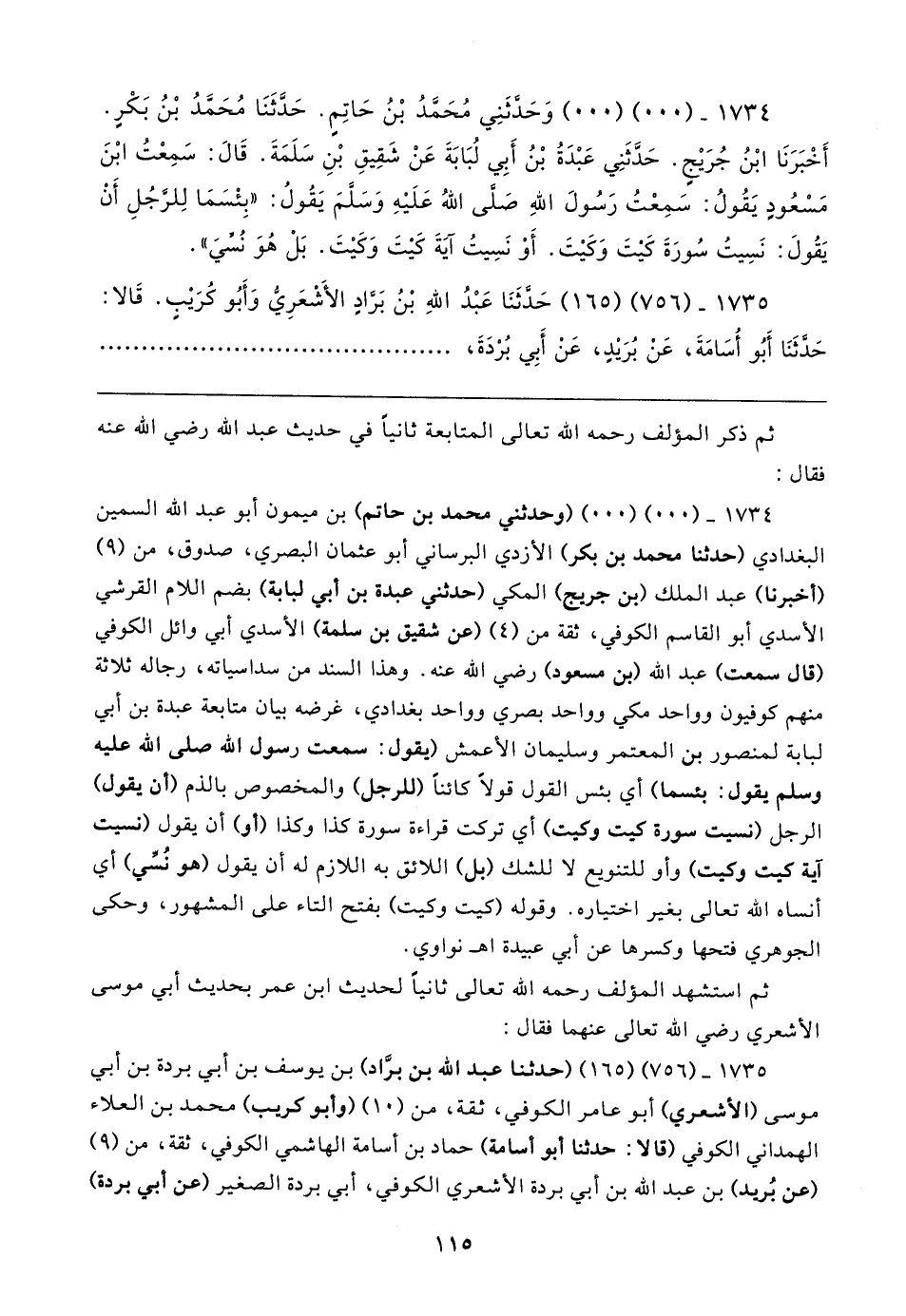 ١٧٣٤ - (٠٠) (٠٠) (وحدثني محمد بن حاتم) بن ميمون أبو عبد الله السمين البغدادي (حَدَّثَنَا محمد بن بكر) الأزدي البرساني أبو عثمان البصري، صدوق، من (٩) (أخبرنا) عبد الملك (بن جريج) المكي (حدثني عبدة بن أبي لبابة) بضم اللام القرشي الأسدي أبو القاسم الكوفي، ثقهَ من (٤) (عن شقيق بن سلمة) الأسدي أبي وائل الكوفي (قال سمعت) عبد الله (بن مسعود) رضي الله عنه. وهذا السند من سداسياته، رجاله ثلاثة منهم كوفيون وواحد مكي وواحد بصري وواحد بغدادي، غرضه بيان متابعة عبدة بن أبي لبابة لمنصور بن المعتمر وسليمان الأعمش (يقول: سمعت رسول الله صلى الله عليه وسلم يقول: بئسما) أي بئس القول قولًا كائنًا (للرجل) والمخصوص بالذم (أن يقول) الرجل (نسيت سورة كيت وكيت) أي تركت قراءة سورة كذا وكذا (أو) أن يقول (نسيت آية كيت وكيت) وأو للتنويع لا للشك (بل) اللائق به اللازم له أن يقول (هو نُسِّي) أي أنساه الله تعالى بغير اختياره. وقوله (كيت وكيت) بفتح التاء على المشهور، وحكى الجوهري فتحها وكسرها عن أبي عبيدة اهـ نواوي.