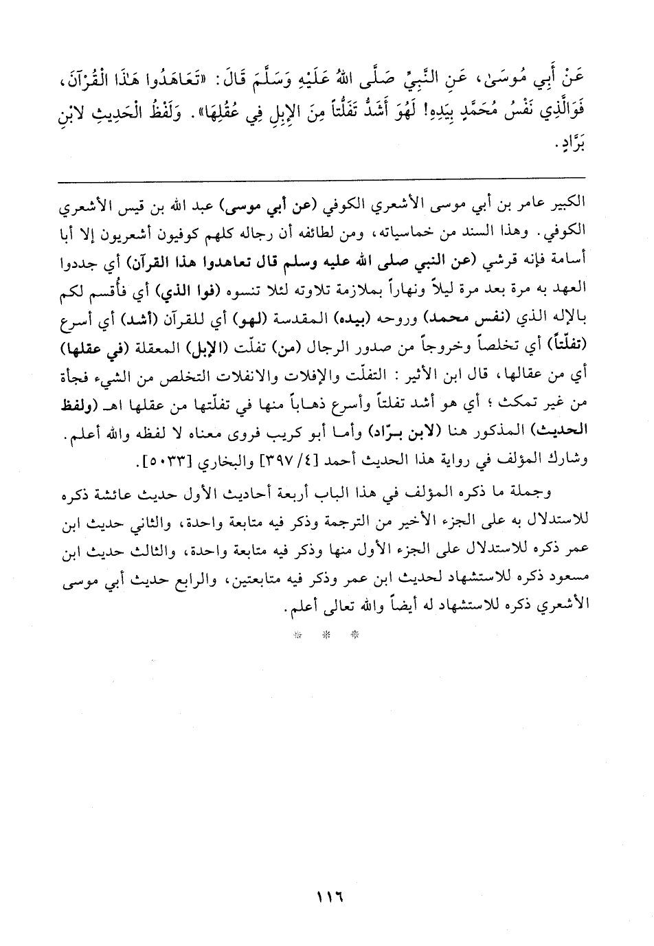 عَنْ أَبِي مُوسَى، عَنِ النَّبِيِّ صَلَّى اللهُ عَلَيهِ وَسَلَّمَ قَال: "تَعَاهَدُوا هَذَا الْقُرْآنَ، فَوَالَّذِي نَفْسُ مُحَمَّدٍ بِيَدِهِ! لَهُوَ أَشَدُّ تَفَلُّتًا مِنَ الإِبِلِ في عُقُلِهَا". وَلَفْظُ الْحَدِيثِ لابْنِ بَرَّادٍ