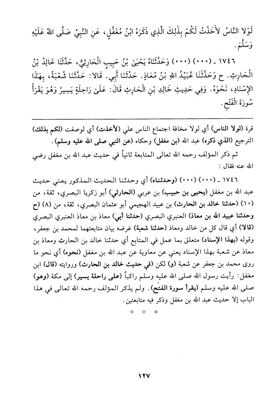 ١٧٤٦ - (٠٠) (٠٠) (وحدثناه) أي وحدثنا الحديث المذكور يعني حديث عبد الله بن مغفل (يحيى بن حبيب) بن عربي (الحارثي) أبو زكريا البصري، ثقة، من (١٠) (حَدَّثَنَا خالد بن الحارث) بن عبيد الهجيمي أبو عثمان البصري، ثقة، من (٨) (ح وحدثنا عبيد الله بن معاذ) العنبري البصري (حَدَّثَنَا أبي) معاذ بن معاذ العنبري البصري (قالا) أي قال كل من خالد ومعاذ (حَدَّثَنَا شعبة) غرضه بيان متابعتهما لمحمد بن جعفر، وقوله (بهذا الإسناد) متعلق بما عمل في المتابع أي حَدَّثَنَا خالد بن الحارث ومعاذ بن معاذ عن شعبة بهذا الإسناد يعني عن معاوية عن عبد الله بن مغفل (نحوه) أي نحو ما روى محمد بن جعفر عن شعبة (و) لكن (في حديث خالد بن الحارث) وروايته (قال) ابن مغفل: رأيت رسول الله صلى الله عليه وسلم راكبًا (على راحلة يسير) إلى مكة (وهو) صلى الله عليه وسلم (يقرأ سورة الفتح). ولم يذكر المؤلف رحمه الله تعالى في هذا الباب إلَّا حديث عبد الله بن مغفل وذكر فيه متابعتين.