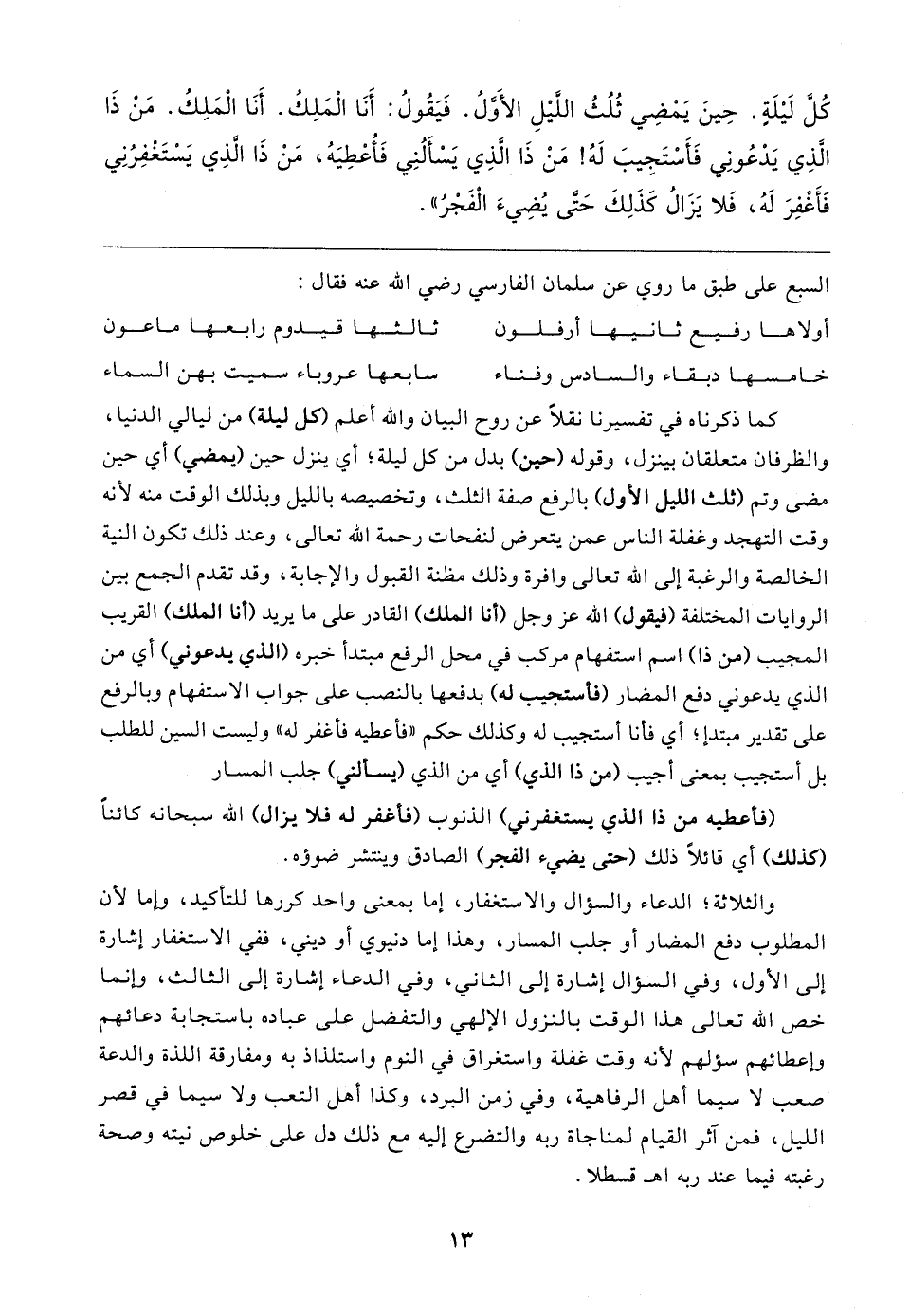 كُل لَيلَةٍ. حِينَ يَمْضِي ثُلُثُ الليلِ الأولُ. فَيَقُولُ: أَنَا الْمَلِكُ. أَنَا الْمَلِكُ. مَنْ ذَا الَّذِي يَدْعُونِي فَأسْتَجِيبَ لَهُ! مَنْ ذَا الذِي يَسْأَلُنِي فَأُعْطِيَهُ، مَنْ ذَا الذِي يَسْتَغْفِرُنِي فَأَغْفِرَ لَهُ، فَلا يَزَالُ كَذَلِكَ حَتى يُضِيءَ الْفَجْرُ"