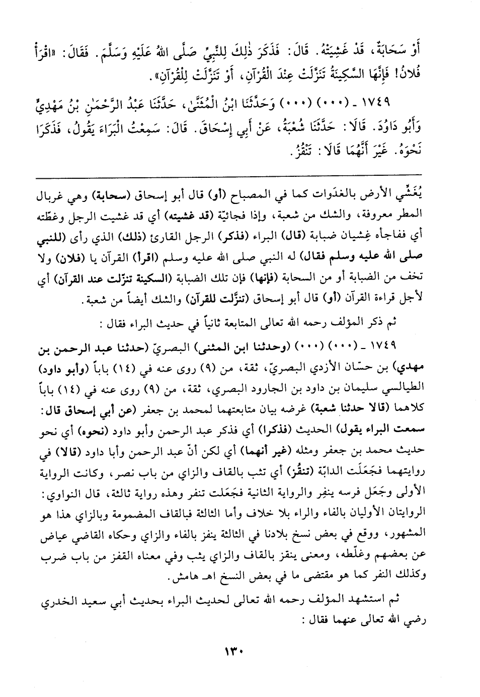 ١٧٤٩ - (٠٠) (٠٠) وحدثنا ابن المثنى) البصريّ (حَدَّثَنَا عبد الرحمن بن مهدي) بن حسَّان الأزدي البصريّ، ثقة، من (٩) روى عنه في (١٤) بابا (وأبو داود) الطيالسي سليمان بن داود بن الجارود البصري، ثقة، من (٩) روى عنه في (١٤) بابا كلاهما (قالا حَدَّثَنَا شعبة) غرضه بيان متابعتهما لمحمد بن جعفر (عن أبي إسحاق قال: سمعت البراء يقول) الحديث (فذكرا) أي فذكر عبد الرحمن وأبو داود (نحوه) أي نحو حديث محمد بن جعفر ومثله (غير أنهما) أي لكن أنّ عبد الرحمن وأبا داود (قالا) في روايتهما فجَعَلَت الدابّة (تنقُز) أي تثب بالقاف والزاي من باب نصر، وكانت الرواية الأولى وجَعَل فرسه ينفِر والرواية الثانية فجَعَلت تنفر وهذه رواية ثالثة، قال النواوي: الروايتان الأوليان بالفاء والراء بلا خلاف وأما الثالثة فبالقاف المضمومة وبالزاي هذا هو المشهور، ووقع في بعض نسخ بلادنا في الثالثة ينفز بالفاء والزاي وحكاه القاضي عياض عن بعضهم وغلّطه، ومعنى ينقز بالقاف والزاي يثب وفي معناه القفز من باب ضرب وكذلك النفر كما هو مقتضى ما في بعض النسخ اهـ هامش.