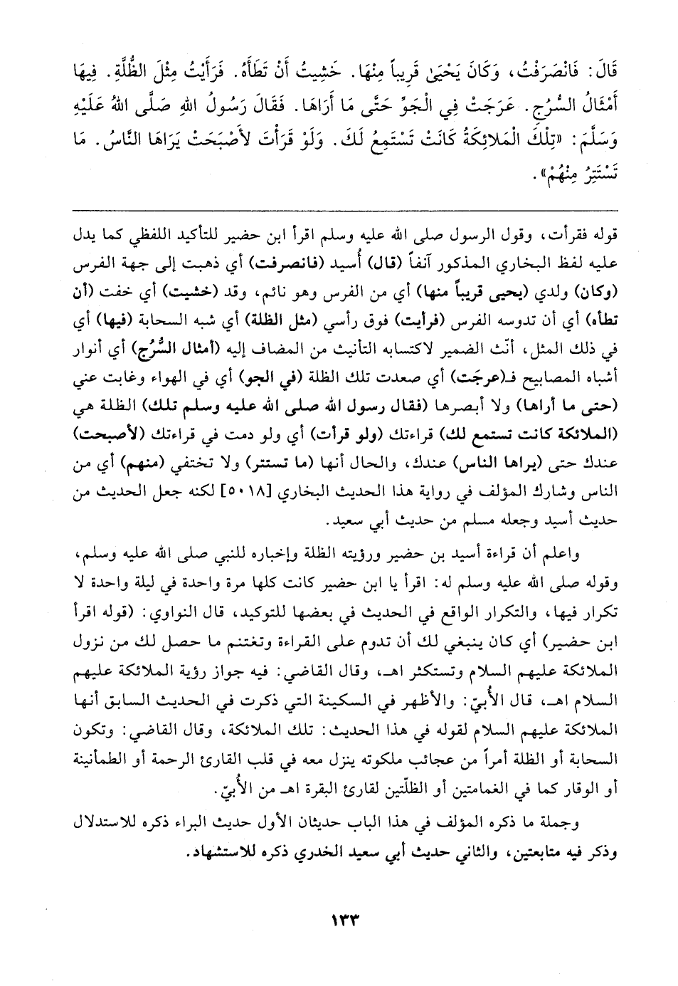 قوله فقرأت، وقول الرسول صلى الله عليه وسلم اقرأ ابن حضير للتأكيد اللفظي كما يدل عليه لفظ البخاري المذكور آنفًا (قال) أُسيد (فانصرفت) أي ذهبت إلى جهة الفرس (وكان) ولدي (يحيى قريبًا منها) أي من الفرس وهو نائم، وقد (خشيت) أي خفت (أن تطأه) أي أن تدوسه الفرس (فرأيت) فوق رأسي (مثل الظلة) أي شبه السحابة (فيها) أي في ذلك المثل، أنّث الضمير لاكتسابه التأنيث من المضاف إليه (أمثال السُّرُج) أي أنوار أشباه المصابيح فـ (عرجَت) أي صعدت تلك الظلة (في الجو) أي في الهواء وغابت عني (حتَّى ما أراها) ولا أبصرها (فقال رسول الله صلى الله عليه وسلم تلك) الظلة هي (الملائكة كانت تستمع لك) قراءتك (ولو قرأت) أي ولو دمت في قراءتك (لأصبحت) عندك حتَّى (يراها الناس) عندك، والحال أنها (ما تستتر) ولا تختفي (منهم) أي من الناس وشارك المؤلف في رواية هذا الحديث البخاري [٥٥١٨] لكنه جعل الحديث من حديث أسيد وجعله مسلم من حديث أبي سعيد.