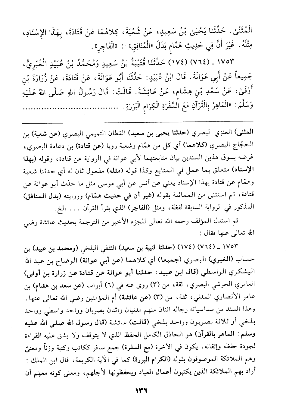 ١٧٥٣ - (٧٦٤) (١٧٤) حَدَّثَنَا قُتَيبَةُ بْنُ سَعِيدٍ وَمُحَمَّدُ بْنُ عُبَيدٍ الْغُبَرِيُّ جَمِيعًا عَنْ أَبِي عَوَانَةَ. قَال ابْنُ عُبَيدٍ: حَدَّثَنَا أَبُو عَوَانَةَ، عَنْ قَتَادَةَ، عَنْ زُرَارَةَ بْنِ أَوْفَى، عَنْ سَعْدِ بْنِ هِشَامٍ، عَنْ عَائِشَةَ. قَالتْ: قَال رَسُولُ اللهِ صَلَّى اللهُ عَلَيهِ وَسَلَّمَ: "الْمَاهِرُ بِالْقُرْآنِ مَعَ السَّفَرَةِ الْكِرَامِ الْبَرَرَةِ