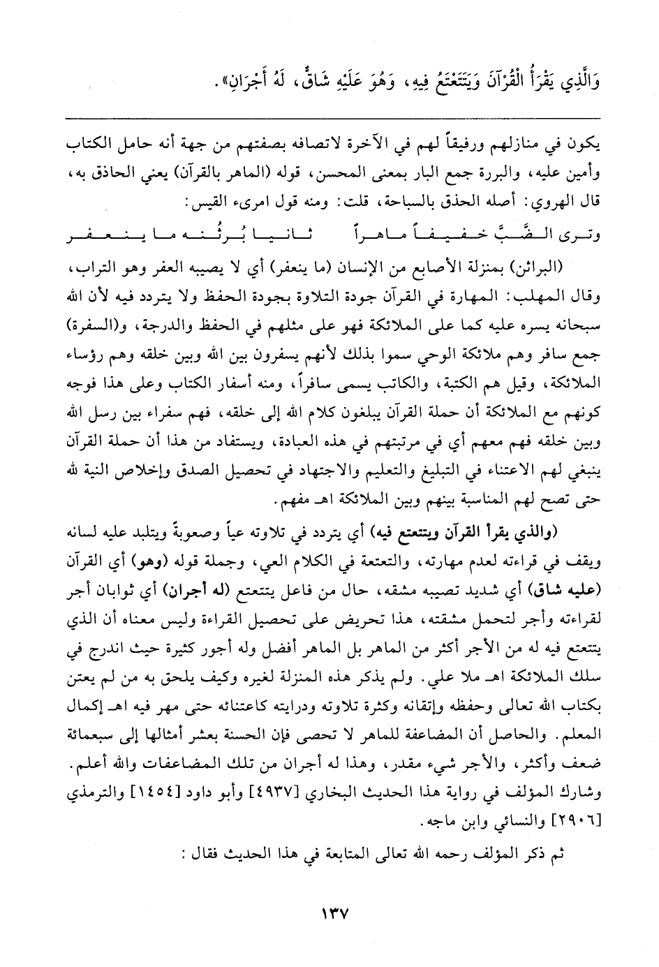 (البراثن) بمنزلة الأصابع من الإنسان (ما ينعفر) أي لا يصيبه العفر وهو التراب، وقال المهلب: المهارة في القرآن جودة التلاوة بجودة الحفظ ولا يتردد فيه لأن الله سبحانه يسره عليه كما على الملائكة فهو على مثلهم في الحفظ والدرجة، و (السفرة) جمع سافر وهم ملائكة الوحي سموا بذلك لأنهم يسفرون بين الله وبين خلقه وهم رؤساء الملائكة، وقيل هم الكتبة، والكاتب يسمى سافرًا، ومنه أسفار الكتاب وعلى هذا فوجه كونهم مع الملائكة أن حملة القرآن يبلغون كلام الله إلى خلقه، فهم سفراء بين رسل الله وبين خلقه فهم معهم أي في مرتبتهم في هذه العبادة، ويستفاد من هذا أن حملة القرآن ينبغي لهم الاعتناء في التبليغ والتعليم والاجتهاد في تحصيل الصدق وإخلاص النية لله حتَّى تصح لهم المناسبة بينهم وبين الملائكة اهـ مفهم.