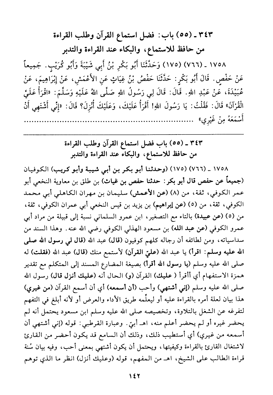 ١٧٥٨ - (٧٦٦) (١٧٥) (وحدثنا أبو بكر بن أبي شيبة وأبو كريب) الكوفيان (جميعًا عن حفص قال أبو بكر: حدثنا حفص بن غياث) بن طلق بن معاوية النخعي أبو عمر الكوفي، ثقة، من (٨) (عن الأعمش) سليمان بن مهران الكاهلي أبي محمد الكوفي، ثقة، من (٥) (عن إبراهيم) بن يزيد بن قيس النخعي أبي عمران الكوفي، ثقة، من (٥) (عن عبيدة) بالتاء مع التصغير، ابن عمرو السلماني نسبة إلى قبيلة من مراد أبي عمرو الكوفي (عن عبد الله) بن مسعود الهذلي الكوفي رضي الله عنه. وهذا السند من سداسياته، ومن لطائفه أن رجاله كلهم كوفيون (قال) عبد الله (قال لي رسول الله صلى الله عليه وسلم: اقرأ) يا عبد الله (عليّ القرآن) لأستمع منك (قال) عبد الله (فقلت) له صلى الله عليه وسلم (يا رسول الله أقرأ) بصيغة المضارع المسند إلى المتكلم مع تقدير همزة الاستفهام أي أأقرأ (عليك) القرآن (و) الحال أنه (عليك أنزل قال) رسول الله صلى الله عليه وسلم (إني أشتهي) وأحب (أن أسمعه) أي أن أسمع القرآن (من كيري) هذا بيان لعلة أمره بالقراءة عليه أو ليعلمه طريق الأداء والعرض أو لأنه أبلغ في التفهم لتفرغه عن الشغل بالتلاوة، وتخصيصه صلى الله عليه وسلم ابن مسعود يحتمل أنه لم يحضر غيره أو لم يحضر أعلم منه، اهـ أبي. وعبارة القرطبي: قوله (إني أشتهي أن أسمعه من غيري) أي أستطيب ذلك، وذلك أن السامع قد يكون أحضر من القارئ لاشتغال القارئ بالقراءة وكيفيتها، ويحتمل أن يكون أشتهي بمعنى أحب، وفيه بيان سُنة قراءة الطالب على الشيخ، اهـ من المفهم، قوله (وعليك أنزل) انظر ما الذي توهم