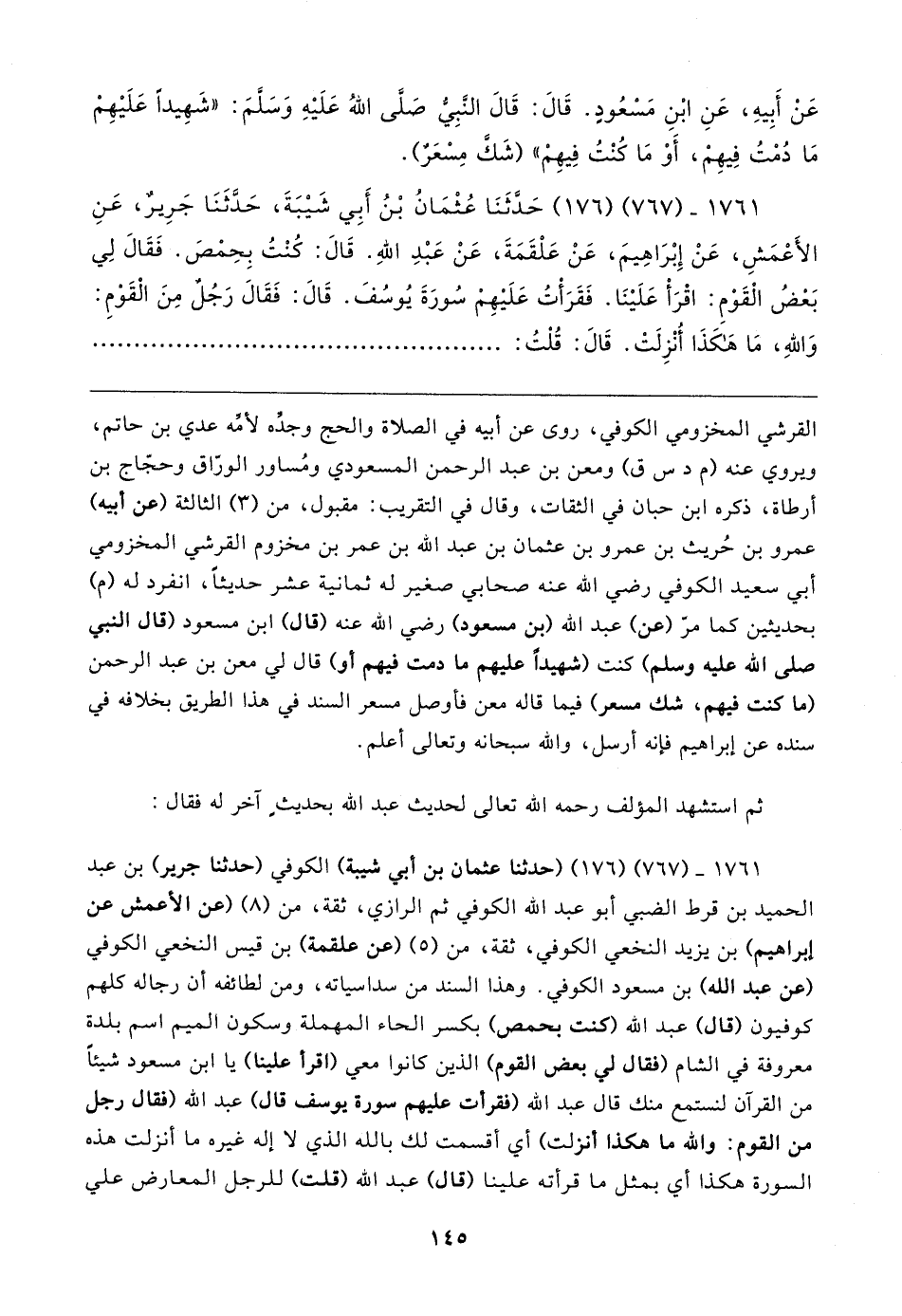 ١٧٦١ - (٧٦٧) (١٧٦) (حدثنا عثمان بن أبي شيبة) الكوفي (حدثنا جرير) بن عبد الحميد بن قرط الضبي أبو عبد الله الكوفي ثم الرازي، ثقة، من (٨) (عن الأعمش عن إبراهيم) بن يزيد النخعي الكوفي، ثقة، من (٥) (عن علقمة) بن قيس النخعي الكوفي (عن عبد الله) بن مسعود الكوفي. وهذا السند من سداسياته، ومن لطائفه أن رجاله كلهم كوفيون (قال) عبد الله (كنت بحمص) بكسر الحاء المهملة وسكون الميم اسم بلدة معروفة في الشام (فقال لي بعض القوم) الذين كانوا معي (اقرأ علينا) يا ابن مسعود شيئًا من القرآن لنستمع منك قال عبد الله (فقرأت عليهم سورة بوسف قال) عبد الله (فقال وجل من القوم: والله ما هكذا أنزلت) أي أقسمت لك بالله الذي لا إله غيره ما أنزلت هذه السورة هكذا أي بمثل ما قرأته علينا (قال) عبد الله (قلت) للرجل المعارض علي