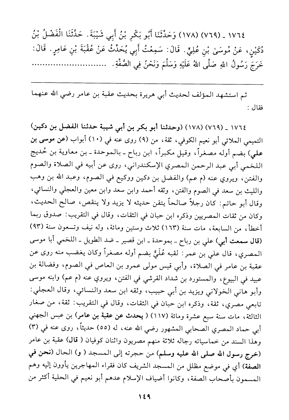 ١٧٦٤ - (٧٦٩) (١٧٨) وَحَدَّثَنَا أَبُو بَكرِ بْنُ أَبِي شَيبَةَ. حَدَّثَنَا الْفَضْلُ بْنُ دُكَينٍ، عَنْ مُوسَى بْنِ عُلِيٍّ. قَال: سَمِعْتُ أَبِي يُحَدِّثُ عَنْ عُقْبَةَ بْنِ عَامِرٍ. قَال: خَرَجَ رَسُولُ اللهِ صَلَّى اللهُ عَلَيهِ وَسَلَّمَ وَنَحْنُ فِي الصُّفَّةِ