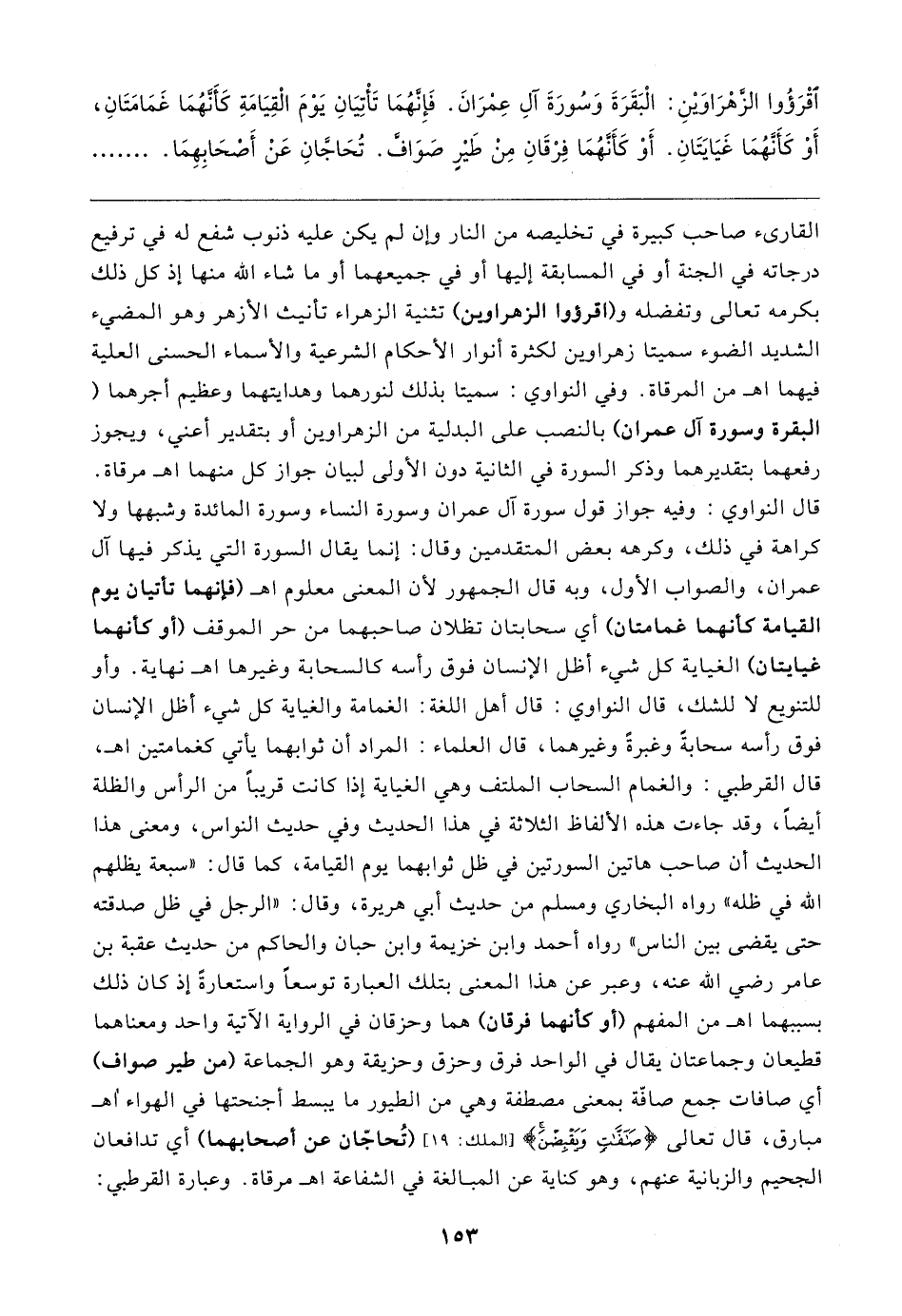 القارئ صاحب كبيرة في تخليصه من النار وإن لم يكن عليه ذنوب شفع له في ترفيع درجاته في الجنة أو في المسابقة إليها أو في جميعهما أو ما شاء الله منها إذ كل ذلك بكرمه تعالى وتفضله و (اقرؤوا الزهراوين) تثنية الزهراء تأنيث الأزهر وهو المضيء الشديد الضوء سميتا زهراوين لكثرة أنوار الأحكام الشرعية والأسماء الحسنى العلية فيهما اهـ من المرقاة. وفي النواوي: سميتا بذلك لنورهما وهدايتهما وعظيم أجرهما (البقرة وسورة آل عمران) بالنصب على البدلية من الزهراوين أو بتقدير أعني، ويجوز رفعهما بتقديرهما وذكر السورة في الثانية دون الأولى لبيان جواز كل منهما اهـ مرقاة. قال النواوي: وفيه جواز قول سورة آل عمران وسورة النساء وسورة المائدة وشبهها ولا كراهة في ذلك، وكرهه بعض المتقدمين وقال: إنما يقال السورة التي يذكر فيها آل عمران، والصواب الأول، وبه قال الجمهور لأن المعنى معلوم اهـ (فإنهما تأتيان يوم القيامة كانهما غمامتان) أي سحابتان تظلان صاحبهما من حر الموقف (أوكانهما غيايتان) الغياية كل شيء أظل الإنسان فوق رأسه كالسحابة وغيرها اهـ نهاية. وأو للتنويع لا للشك، قال النواوي: قال أهل اللغة: الغمامة والغياية كل شيء أظل الإنسان فوق رأسه سحابةً وغبرةً وغيرهما، قال العلماء: المراد أن ثوابهما يأتي كغمامتين اهـ، قال القرطبي: والغمام السحاب الملتف وهي الغياية إذا كانت قريبًا من الرأس والظلة أيضًا، وقد جاءت هذه الألفاظ الثلاثة في هذا الحديث وفي حديث النواس، ومعنى هذا الحديث أن صاحب هاتين السورتين في ظل ثوابهما يوم القيامة، كما قال: "سبعة يظلهم الله في ظله" رواه البخاري ومسلم من حديث أبي هريرة، وقال: "الرجل في ظل صدقته حتى يقضى بين الناس" رواه أحمد وابن خزيمة وابن حبان والحاكم من حديث عقبة بن عامر رضي الله عنه، وعبر عن هذا المعنى بتلك العبارة توسعأ واستعارةَ إذ كان ذلك بسببهما اهـ من المفهم (أو كأنهما فرقان) هما وحزقان في الرواية الآتية واحد ومعناهما قطيعان وجماعتان يقال في الواحد فرق وحزق وحزيقة وهو الجماعة (من طير صواف) أي صافات جمع صافّة بمعنى مصطفة وهي من الطيور ما يبسط أجنحتها في الهواء؛ اهـ مبارق، قال تعالى {صَافَّاتٍ وَيَقْبِضْنَ} [الملك: ١٩] (تُحاجّان عن أصحابهما) أي تدافعان الجحيم والزبانية عنهم، وهو كناية عن المبالغة في الشفاعة اهـ مرقاة. وعبارة القرطبي:
