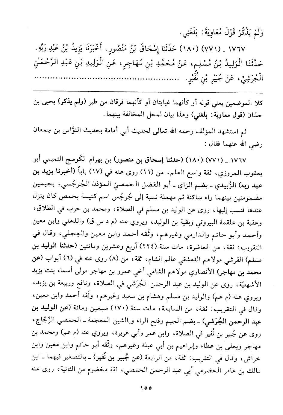 ١٧٦٧ - (٧٧١) (١٨٠) حَدَّثَنَا إِسْحَاقُ بْنُ مَنْصُورٍ. أَخْبَرَنَا يَزِيدُ بْنُ عَبْدِ رَبِّهِ. حَدَّثَنَا الْوَلِيدُ بْنُ مُسْلِمٍ، عَنْ مُحَمَّدِ بْنِ مُهَاجِرٍ، عَنِ الْوَلِيدِ بْنِ عَبْدِ الرَّحْمَنِ الْجُرَشِيِّ، عَنْ جُبَيرِ بْنِ نُفَيرٍ