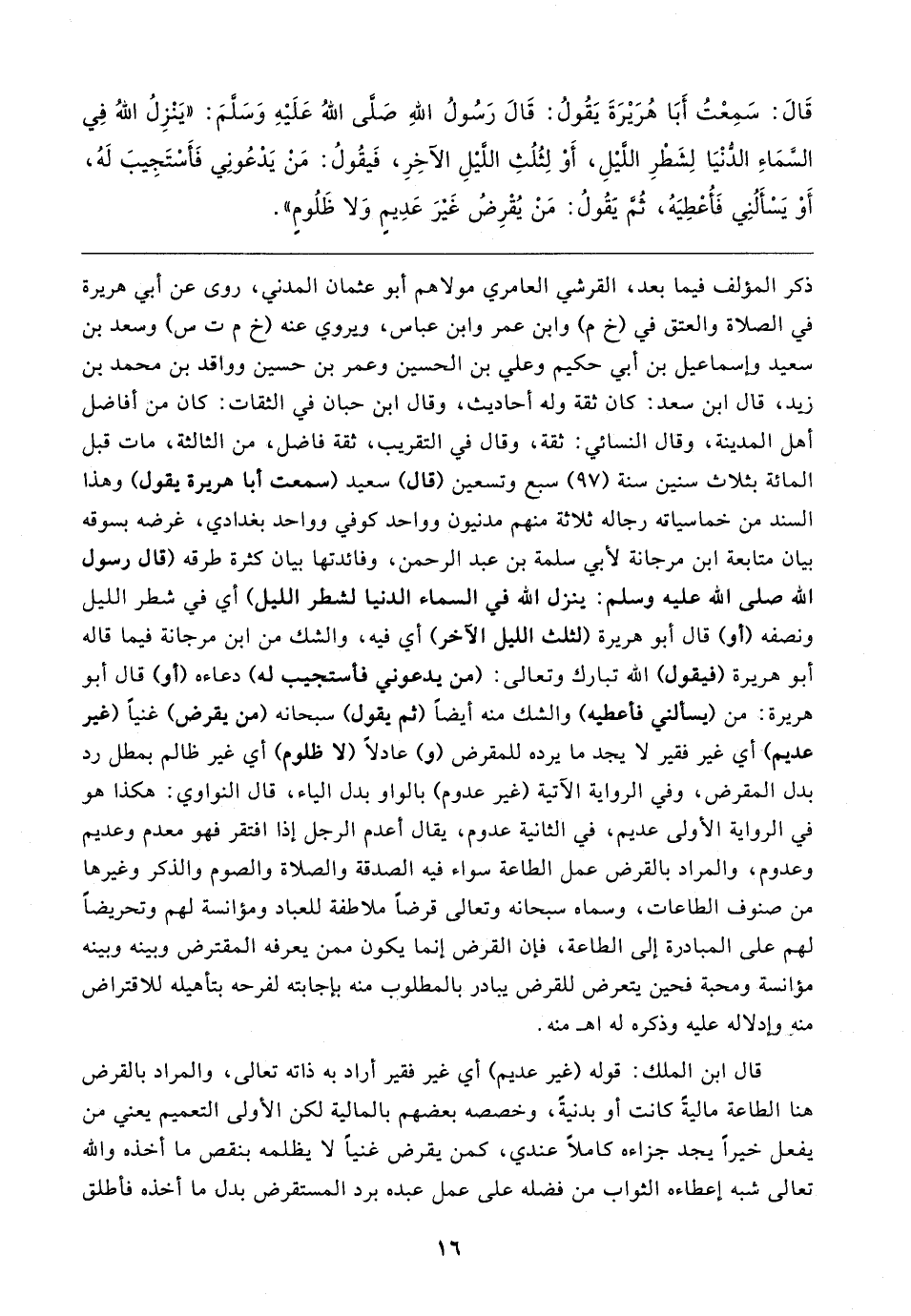 قَال: سَمِعْتُ أَبَا هُرَيرَةَ يَقُولُ: قَال رَسُولُ اللهِ صَلى اللهُ عَلَيهِ وَسَلمَ: "يَنْزِلُ اللهُ فِي السمَاءِ الدُّنْيَا لِشَطْرِ الليلِ، أوْ لِثُلُثِ الليلِ الآخِرِ، فَيقُولُ: مَنْ يَدْعُونِي فَأَسْتَجِيبَ لَهُ، أَوْ يَسْألُنِي فَأُعْطِيَهُ، ثُم يقُولُ: مَنْ يُقْرِضُ غيرَ عَدِيمٍ وَلا ظَلُومٍ"