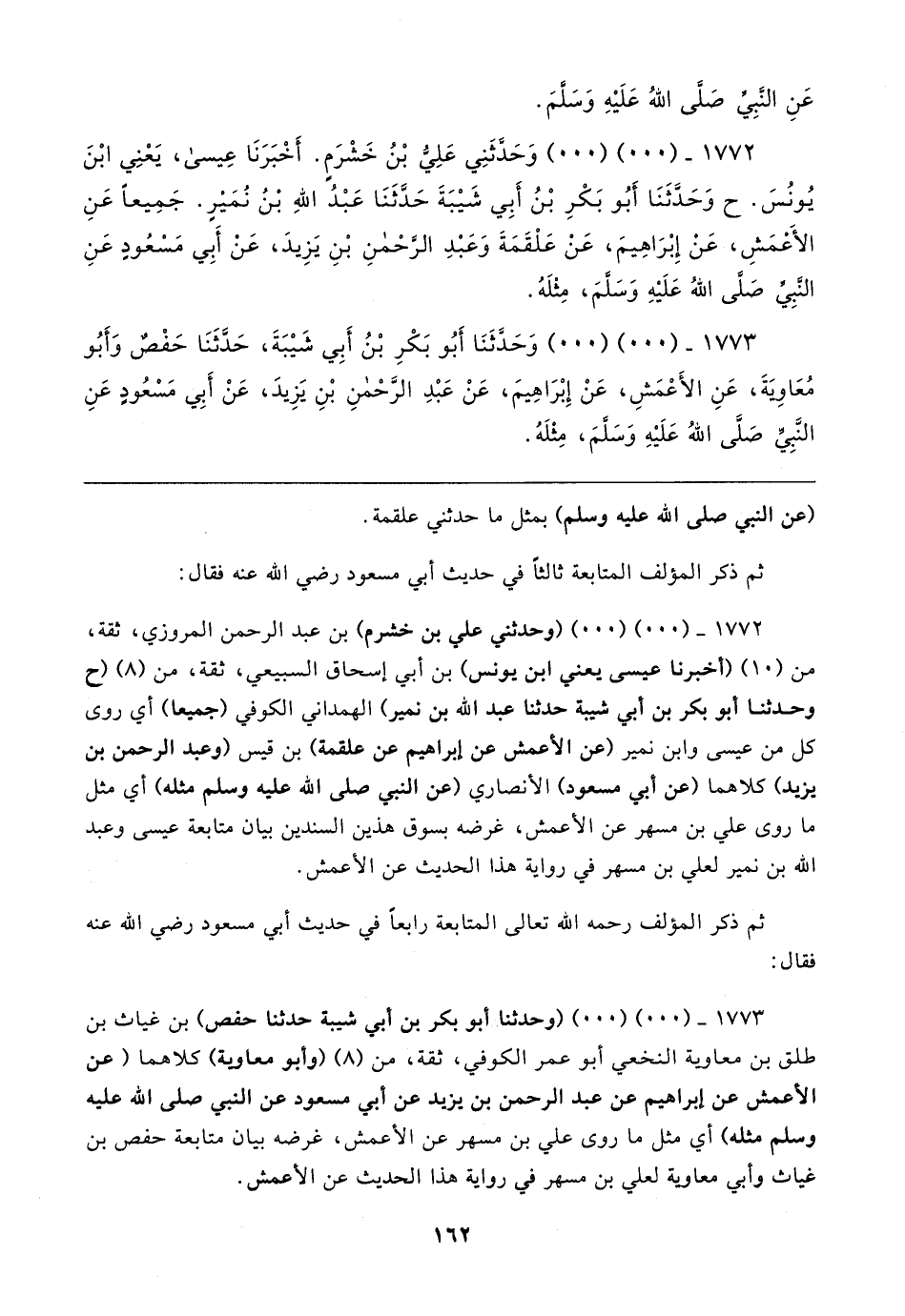 ١٧٧٣ - (٠٠) (٠٠) (وحدثنا أبو بكر بن أبي شيبة حدثنا حفص) بن غياث بن طلق بن معاوية النخعي أبو عمر الكوفي، ثقة، من (٨) (وأبو معاوية) كلاهما (عن الأعمش عن إبراهيم عن عبد الرحمن بن يزيد عن أبي مسعود عن النبي صلى الله عليه وسلم مثله) أي مثل ما روى علي بن مسهر عن الأعمش، غرضه بيان متابعة حفص بن غياث وأبي معاوية لعلي بن مسهر في رواية هذا الحديث عن الأعمش.